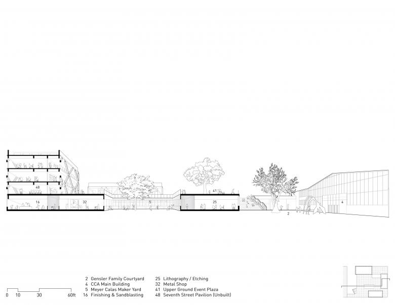 Founded during the Arts and Crafts movement at the turn of the 20th century, CCA has grown to encompass 34 art and design disciplines, from jewelry, ceramics, and textiles to metal arts, architecture, and animation. Conceived as a creative ecosystem where different disciplines can productively interact and overlap, the 82,305 square foot building provides new art-making facilities, learning spaces, and green spaces that support its diverse community. The concrete ground level is a hub of indoor-outdoor workshops for more physically intensive creative practices and large-scale fabrication. Organized around shared materials and equipment, this level’s open, flexible plan makes the different programs visible and accessible to one another, promoting interdisciplinary interaction. Carved out of the concrete lower level, two large maker yards provide additional workspace and enable fresh air and natural light to penetrate deep within the interior.