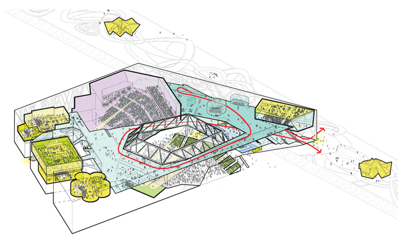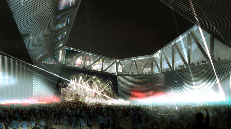 Two primary venues compose the building: the one-of-a-kind Oculus (which accommodates 13,000 fans under a giant void that opens to the sky) and the Indoor Main Hall (which can hold 5600 fans in a range of configurations). Leading to the Main Hall are the "Famous Steps,” whose amphitheatre-like topography creates opportunities for spontaneous performances and social gatherings. Additional program—including restaurants, retail kiosks, and recording booths—is connected by the “Public Loop” that culminates at the Hall of Fame on the building’s third and highest floor.