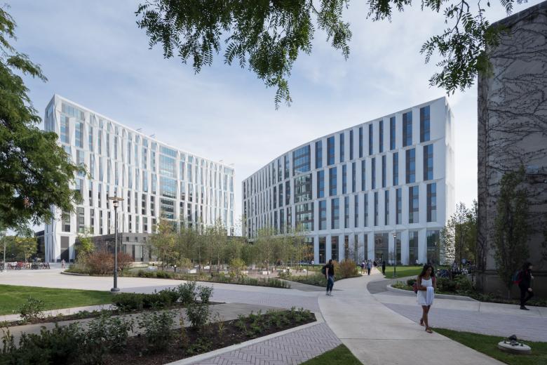 This dynamic mix of new residences, dining, retail, amenities, and outdoor spaces extends the University’s footprint to the north. The location allows the design to create a new “front door” for the University with an open and welcoming ambiance, strengthening pedestrian connections between campus and the greater Hyde Park neighborhood. With its careful assemblage of four slender bar buildings, the project integrates students and community within an urban fabric of plazas, gardens, walkways, and courtyards that offer distinct, human-scaled outdoor environments. And while the buildings are oriented to optimize energy performance by maximizing daylight and natural ventilation, they simultaneously create the kind of sunlit urban landscape and lively social vibe that students want.