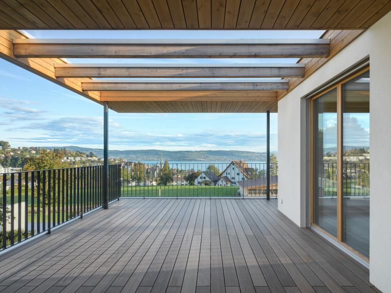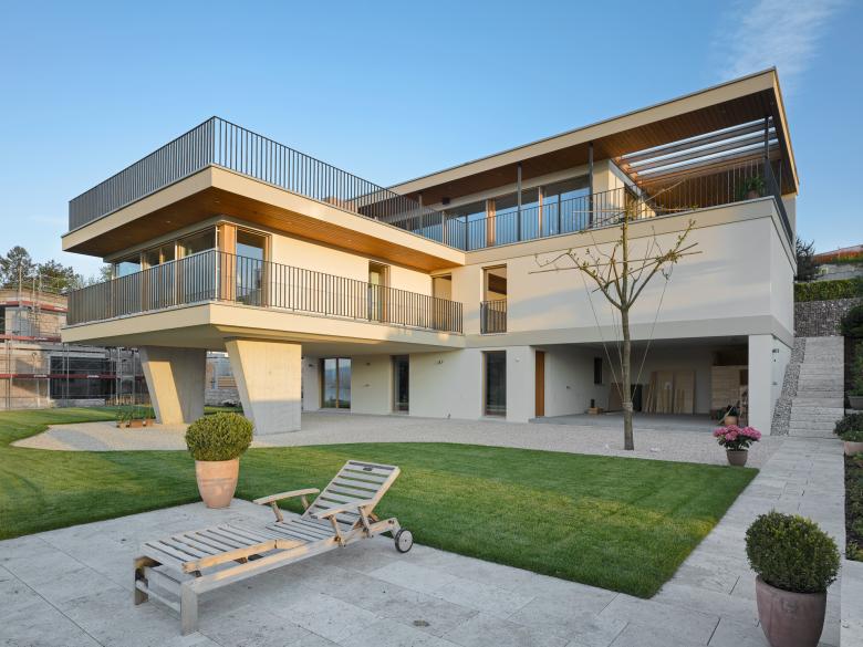 The VILLA L is situated in the vicinity of Lake Zurich and has a unique terrace, which promises an enchanting panoramic view of the Alps. The villa offers three bedrooms, three bathrooms, one indoor and one outdoor wellness area as well as two indoor and two outdoor parking spaces on three floors. The wide bay windows, which convey a certain airiness, evoke a sovereign level of relaxation. The master suite has a modern walk-in wardrobe and a Mediterranean-style private bathroom. More at https://www.studioforma.ch/architecture-projects/residential/villa-l