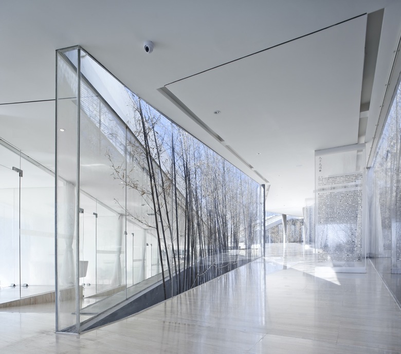 The floor thickness and column size are made to their minimum dimensions to emphasize the “light” character of building and feeling of floating. The materials such as low iron glass, white aluminum panel, travertine floor, precast concrete panel and translucent glass partition are used to gain formal abstraction and to create the atmosphere of simplicity and purity. In the context of lacking local materials and craftsmanship, an abstract form becomes a natural choice aesthetically.