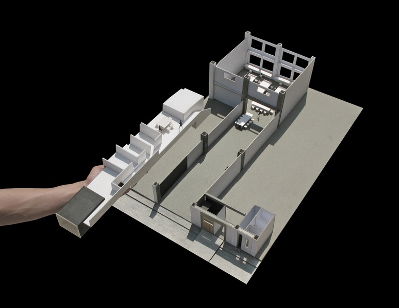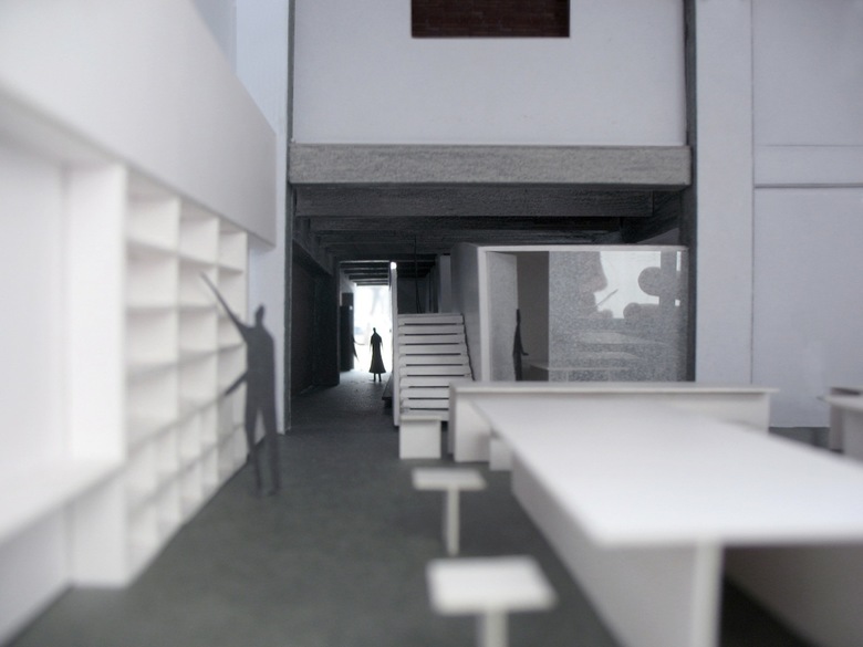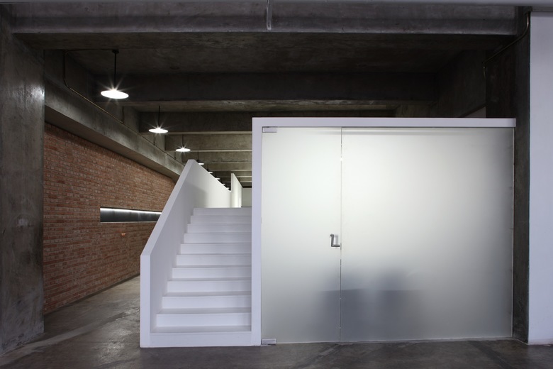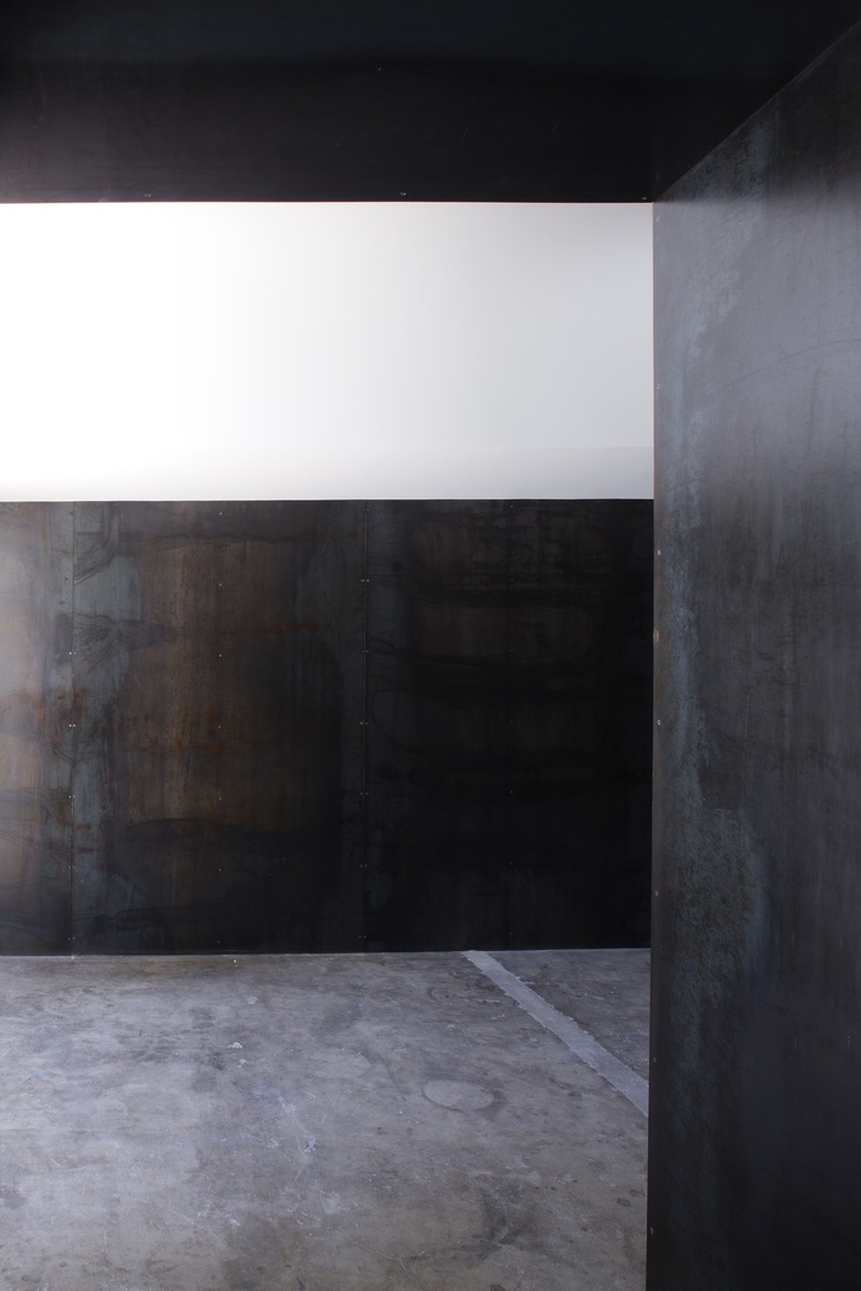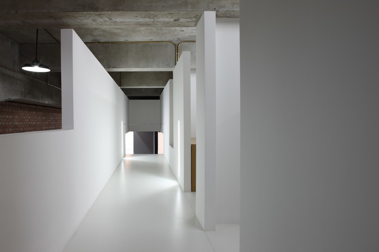 While the major materials used for new elements are steel plate, frost glass, white gypsum board wall and vinyl floor to create abstraction of pure volume, the original material of existing elements such as concrete, steel and wood is re-exposed by removing the paint so as to emphasize its tectonic. Thus a strong contrast is created between the abstraction of new element and heavy textured existing structure.