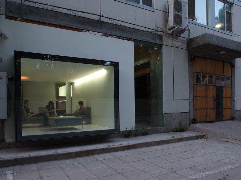 Located in an aeronautical factory on North 3rd Ring of Beijing, the existing warehouse is a three bay 36 meter deep concrete structure, with 4 meter high space in first two bays and 7.8 meter space in last bay. The key issue of design is to preserve the full height space for work area by inserting a mezzanine floor in 4 meter high space, creating extra work area on top and storage space underneath it. The contrast between very low space on mezzanine and very high space of main area generates a spatial tension. A niche underneath the cantilevered floor functions as the model displays. The original facade is demolished and changed into full height glazing to reveal the inserted white volume of intervention. The lounge room, as a new element, is projected out from facade and turned into a showcase.