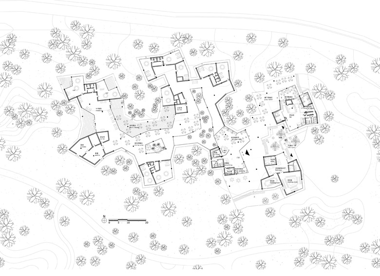 The architecture is mainly constructed from wood and rammed earth. These materials are able to breath, adjusting the relative humidity and temperature of indoor and outdoor areas, and will biodegrade in the future. Glass curtain walls are filled between timber structures and rammed earth walls on facades, providing the experience of being in the manmade and natural forest at the same time.