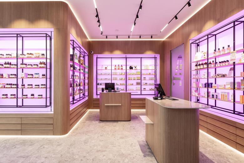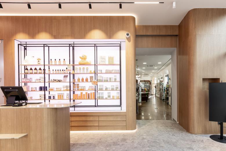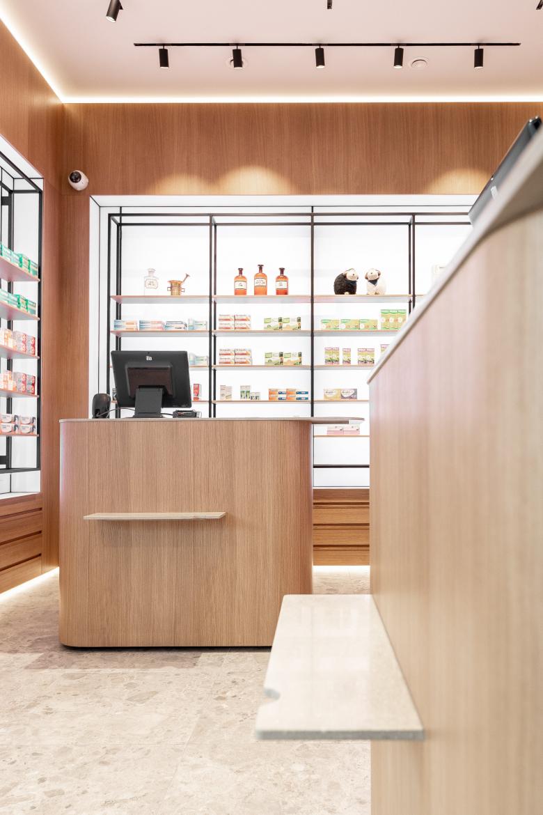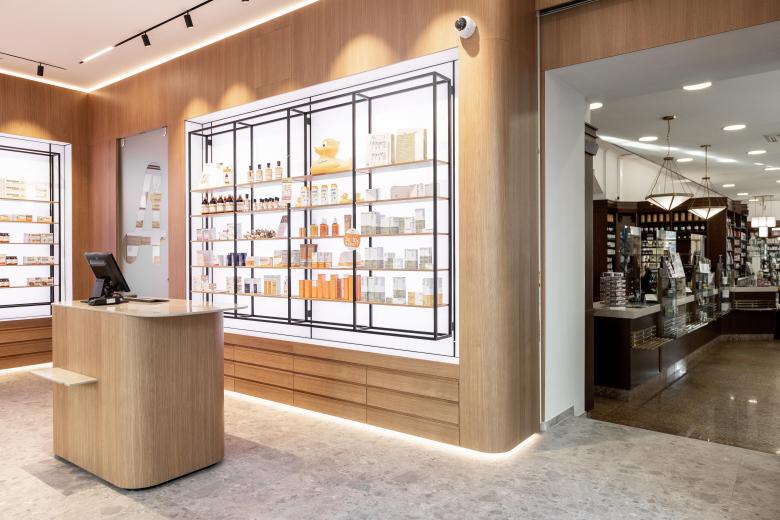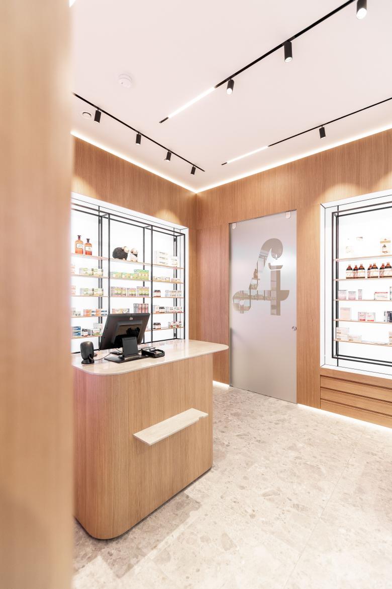 Die Innenarchitektur referenziert auf die Bestandmöbel im Altbau der Apotheke, indem die gediegene Holzoptik aufgenommen und zeitgemäß interpretiert wird. Die Rückwände der Möbel sind als große LED Screens ausgeführt und können damit in allen Farben die Gesamtszenerie bestimmen.