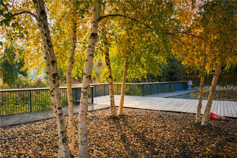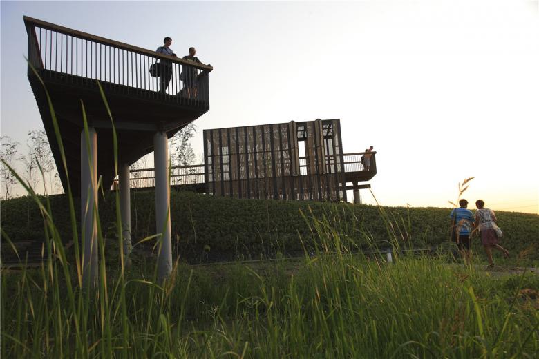 (4) A skywalk links the scattered mounds allowing residents to have an above-the-wetland and in-the-canopy experience. Platforms, five pavilions (Bamboo, Wood, Brick, Stone, and Metal), and two viewing towers (one made of steel and located at the east corner, the other one made of wood and looking like a tree at the north-west corner) are set on the mounds and connected by the skywalk, allowing visitors to have views into the distance and observation of nature in the center of the park.