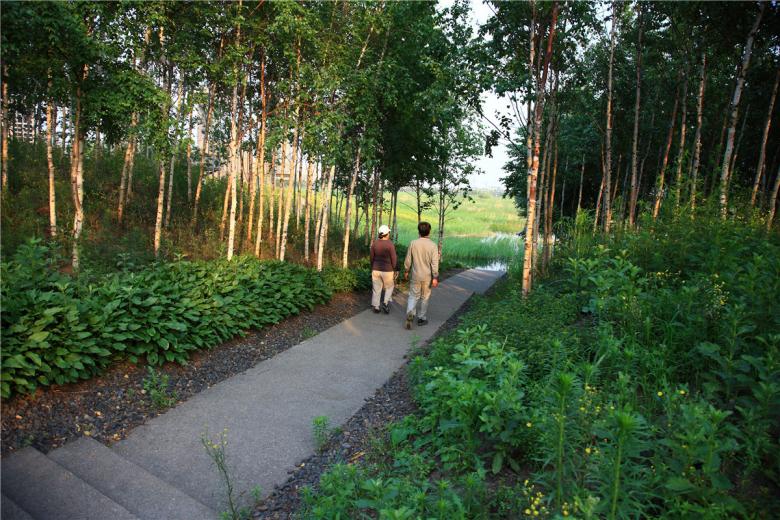 (3) The network of paths and platforms: A network of paths links the ring of ponds and mounds, allowing visitors to have a walking-through-forest experience. Platforms and seats are put near the ponds to enable people to have close contact with nature.