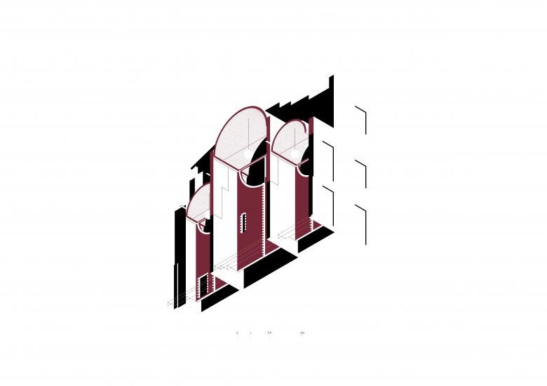 Con ladrillo hueco, se construye una escenografía de urgencia que completa lo que insinúan los contrafuertes, dejando ver en el fondo las huellas de la actividad doméstica marcadas en la medianera. Una construcción de tres bóvedas y cuatro nichos se ofrece al espacio público como una fachada porosa, acompañada de un mínimo graderío. Es una estructura inacabada y apropiable. El artista visual Quim Domene interviene a posteriori en los nichos, con elementos alegóricos a la historia del barrio.