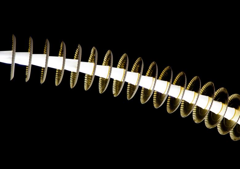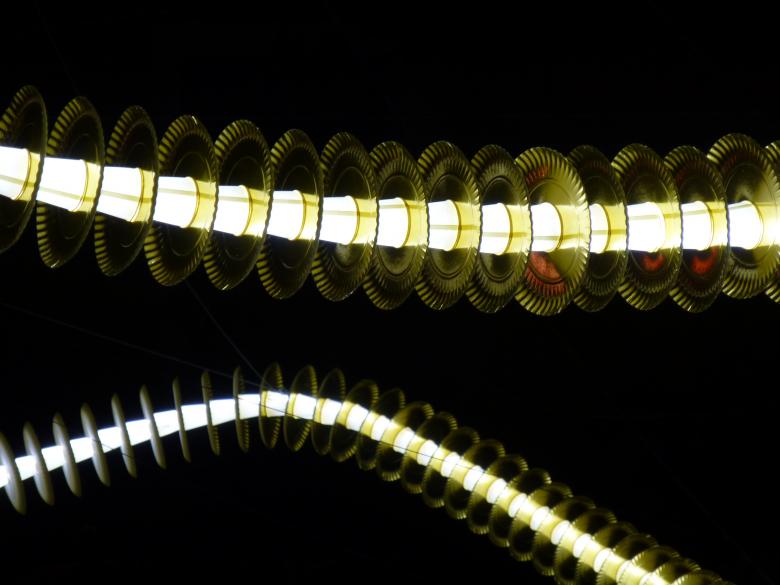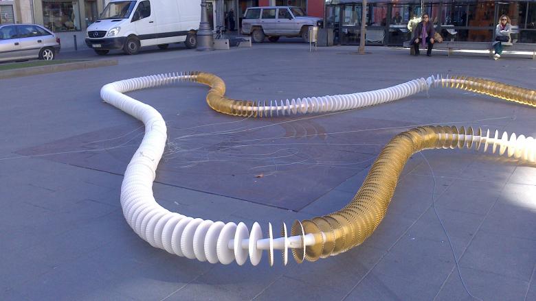 Aprovechar el cableado existente en la plaza mayor para suspender la instalación, supone desarrollar un artefacto con una carga máxima de 50 Kg sin renunciar a una buena longitud. El alma de la lámpara es un tubo multicapa de fontanería que se caracteriza por la ligereza, la resistencia y la plasticidad. Las piezas de unión tienen un estrangulamiento que permite fijar los cables de suspensión sin malograr el tubo, puesto que después se reutilizará.