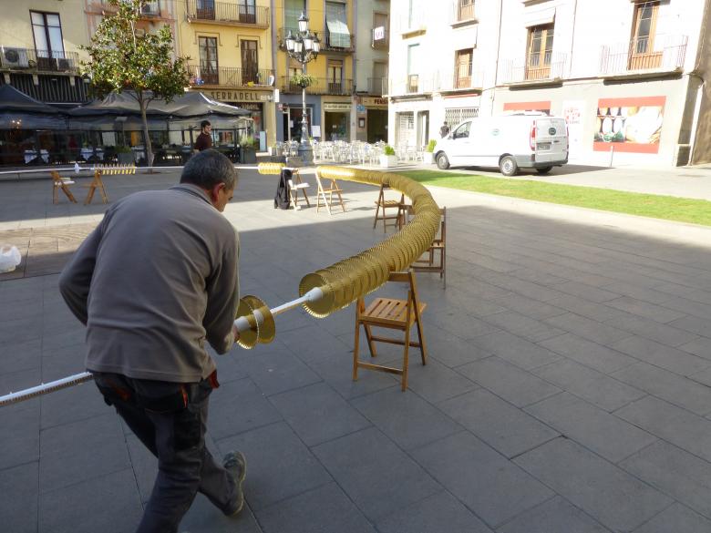 Acomodar, acompañar, techar un concierto de jazz en la Plaza Mayor de Olot. Construir una atmósfera para una noche fría con los matices y reflejos de una nube dorada. Suspender un radiador luminoso de 35 metros de longitud, a baja altura, construido con cartón alternando vasos de café y bandejas de pastelería. Señalar el centro de la plaza y de la ciudad, con la reverberación del público y una alfombra reflectante de confeti. Domesticar el espacio público con pocos recursos.