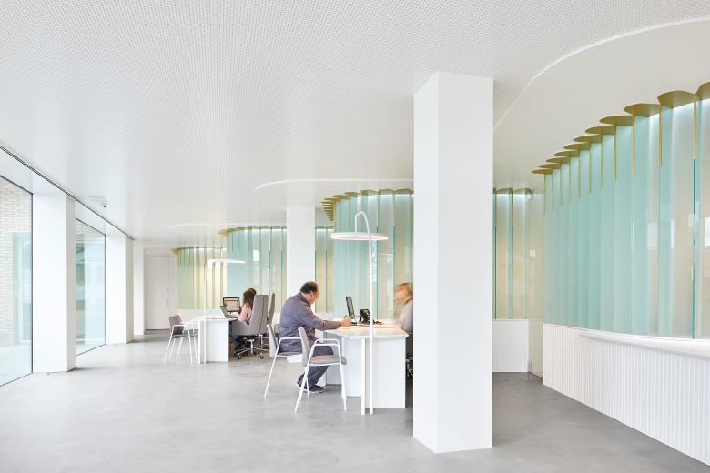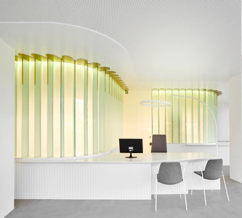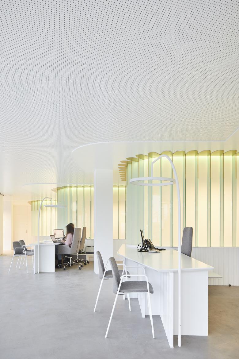 Sobre la diagonal del local se instala un radiador luminoso, de geometría ondulada, que reconoce la esquina y separa la oficina en dos ámbitos: uno dedicado a la atención al público y otro para despachos y dependencias privadas.