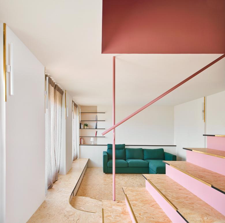 La escalera permite apoyar la cocina reubicada. Por el otro lado se abre a la estancia principal, una sala generosa de 4 x 4m. La acotan una serie de diafragmas, como un dintel escalonado, un zócalo alto o la misma tarima. Estos elementos gradúan la jerarquía respecto al resto de espacios domésticos y contribuyen a la profundidad visual.