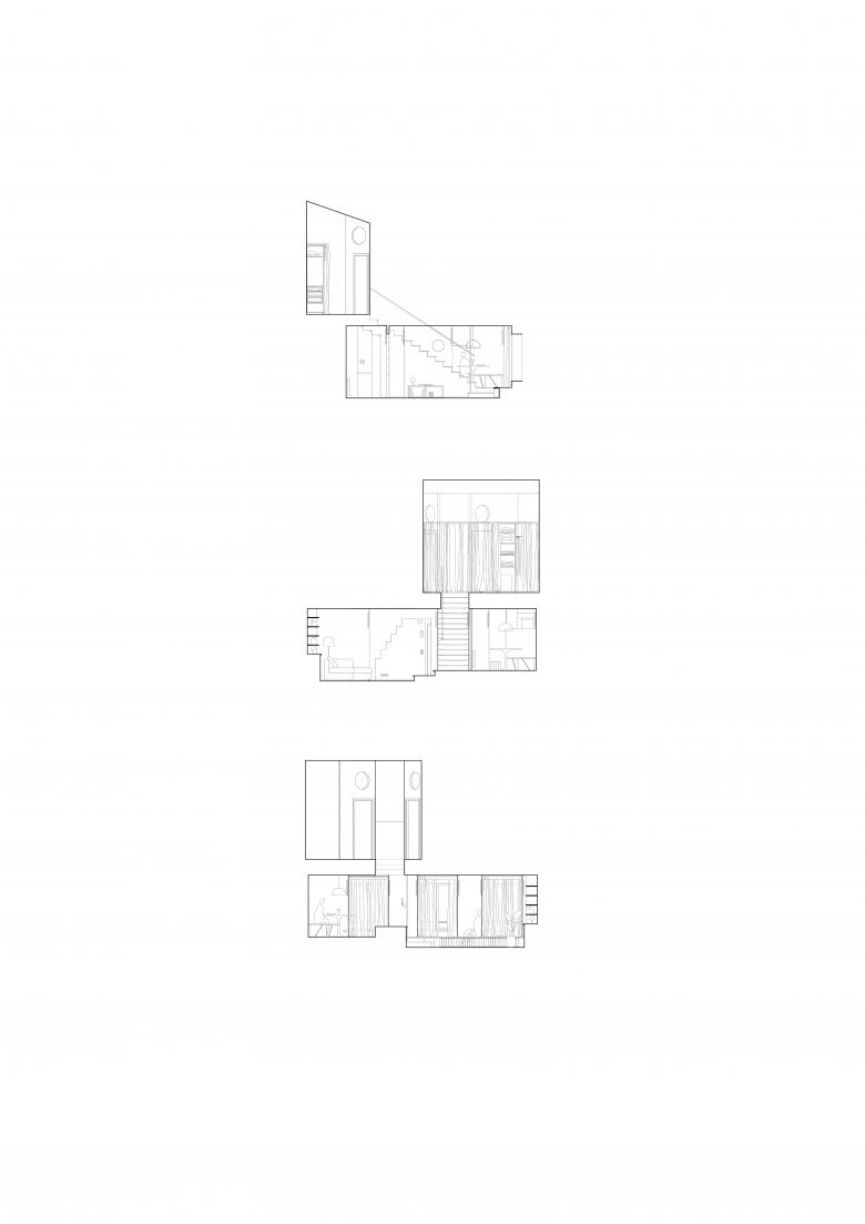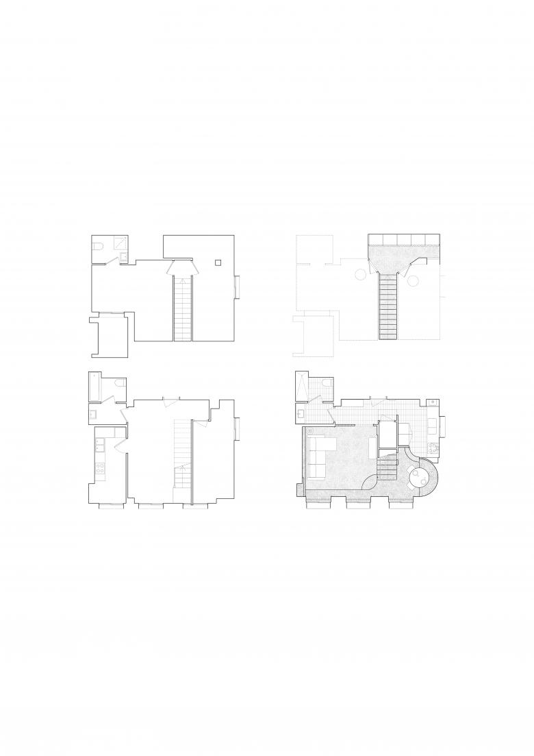 Un frente con tres huecos repetidos, de antepecho bajo y orientados a poniente; una escalera de tramo recto enfrentada con la ventana central. Estos elementos toman valor y estructuran el esponjamiento de un piso dúplex para una pareja. Es una vivienda muy fragmentada y con piezas demasiado estrechas.