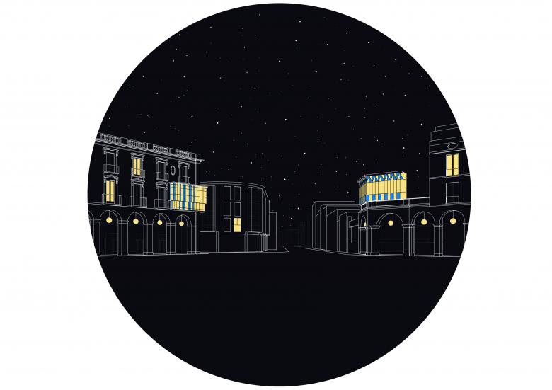 La ciudad está hecha de casas, pero también podemos decir que está hecha de ventanas, sobretodo por la noche. Algunas ventanas son especiales y están en las esquinas, ayudando a configurar los lugares públicos singulares y dar sentido a ciertas perspectivas urbanas. La pieza para el festival Lluèrnia parte de estas premisas. Se instala en una de las esquinas de la plaza Clará de Olot, una plaza porticada rectangular, de composición unitaria e inspiración neoclásica.