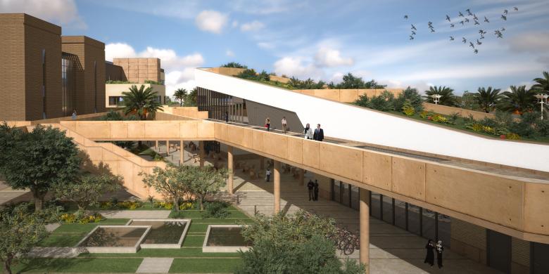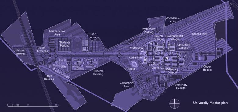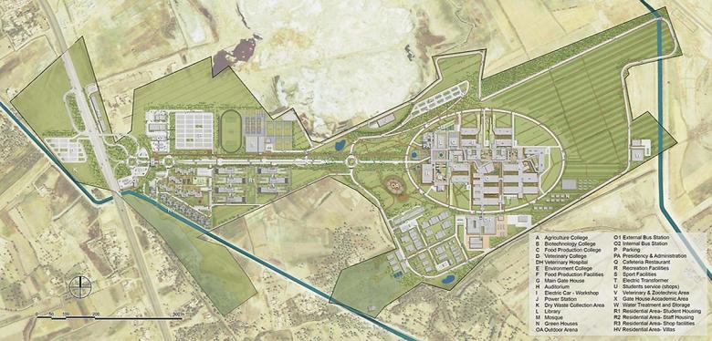 The campus is organized as an ancient city: in the center the main square with the most representative buildings, out of the elliptical "city walls", the fields with the animals. Our vision of a sustainable university campus is geared towards the creation of a contemporary campus, but not technological. This will be the first eco-friendly campus in Iraq and the presidency will be the first LEED-certified building in Iraq.