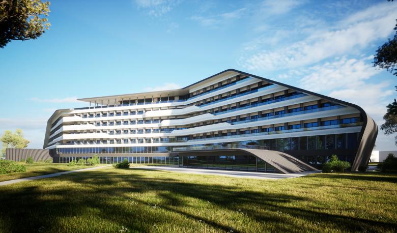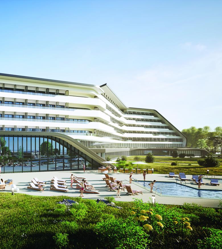The curvilinear shape that characterizes the hotel's layout stems from the desire to follow the contours of the lake's coastline. From the floor plan, the curves become three-dimensional, defining the building with planes flexed into soft lines that embrace the volumes of the structure. While the curved planes create the solid parts of the structure and the roofs, all the vertical closures that form the skin of the interior spaces are marked by the lightness of the glass.