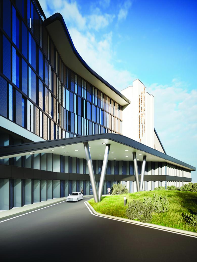 On the building's entrance, the façade delimiting the corridors of the guestroom floors is treated with a random alternation of glass and opaque panels. The continuity of this pattern and its sinuous structure is interrupted at two points by the solid, vertical white volumes that house the connecting systems.