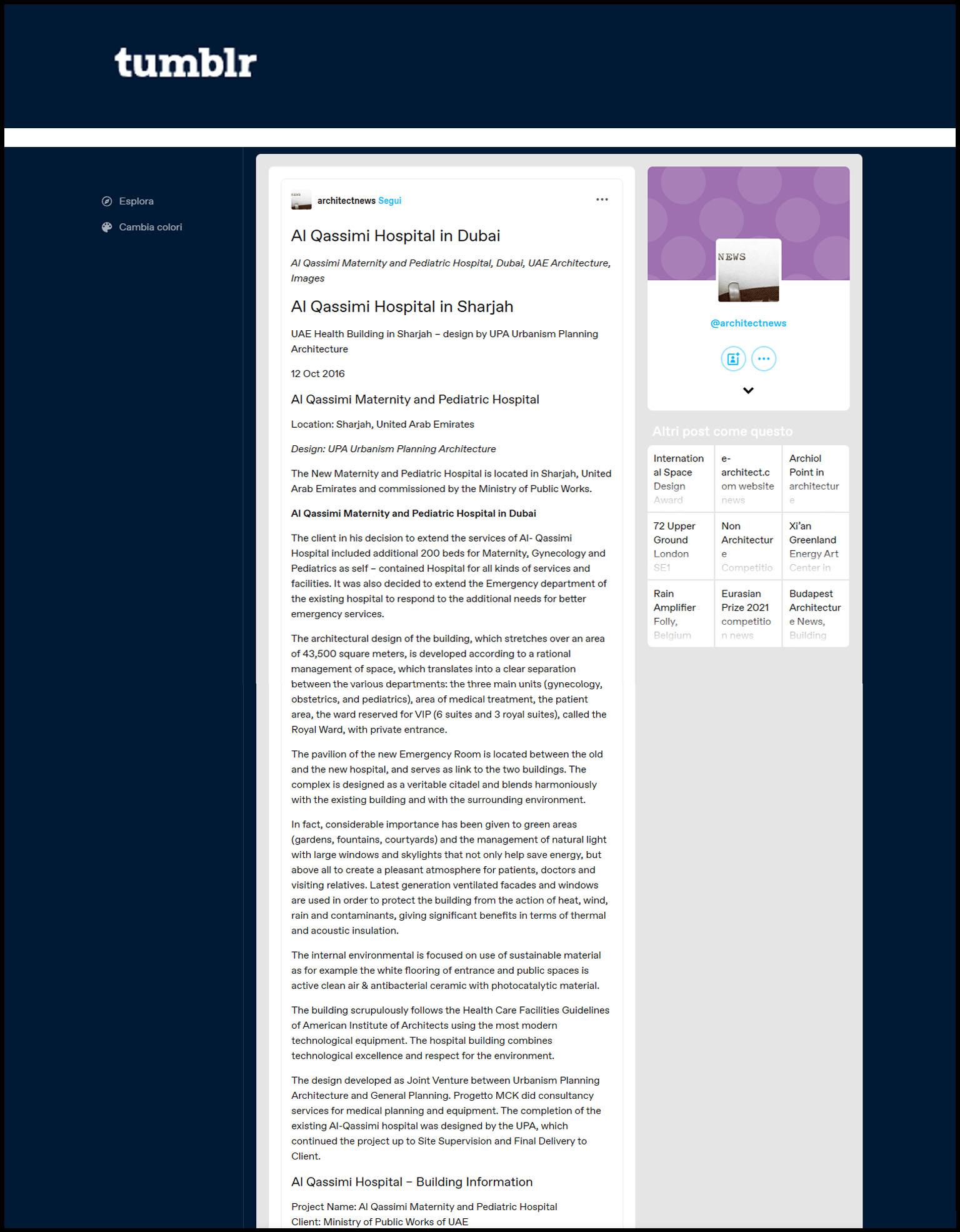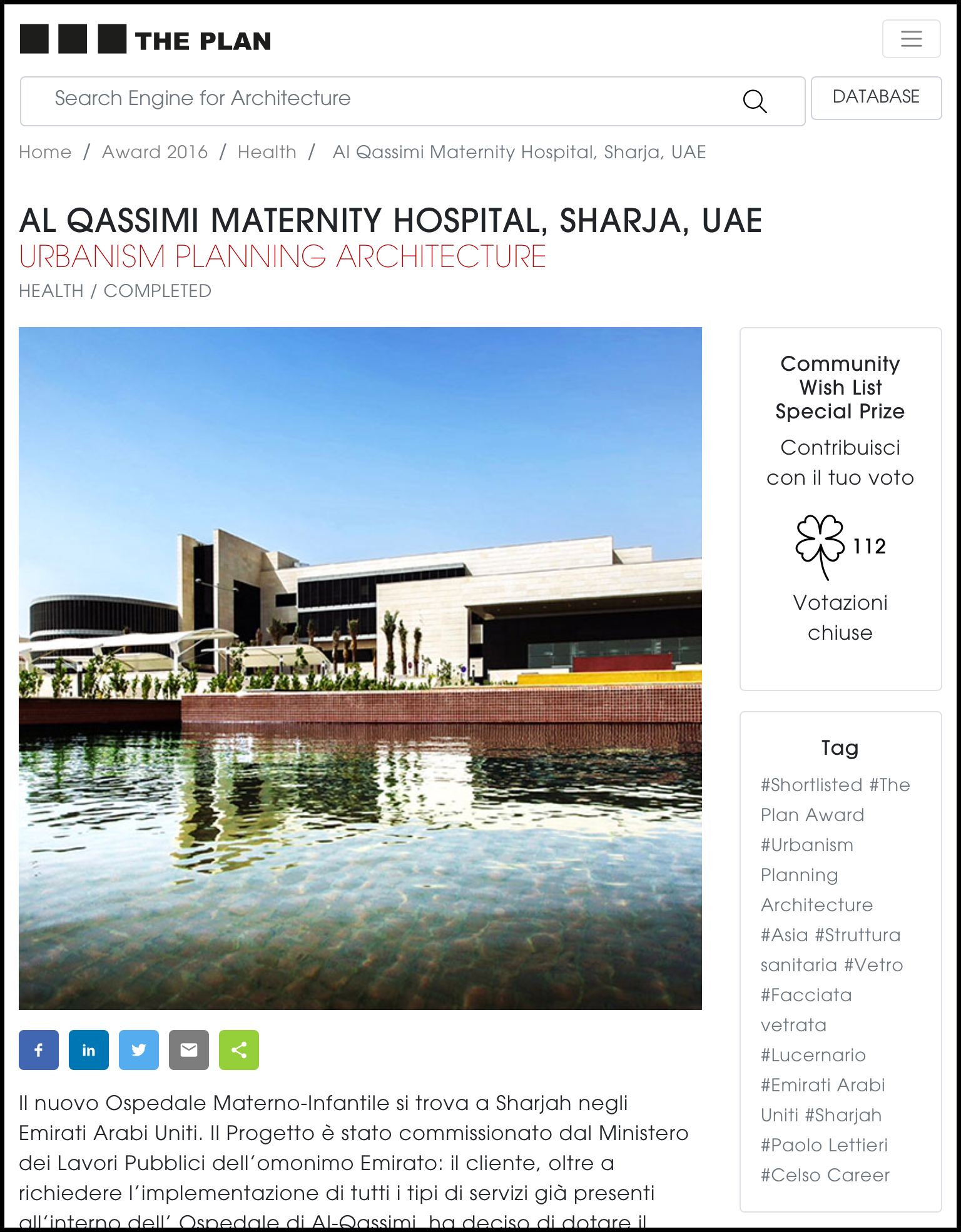 The new maternity and pediatric hospital commissioned by the Ministry of Public Works is located in Sharjah, in the United Arab Emirates. The hospital, a completion of the existing one in Al Qassimi, was designed by UPA Italia by Paolo Lettieri Architects and UPA, an international architecture firm that draws on the expertise of the Italian architect Paolo Lettieri. - verder lezen