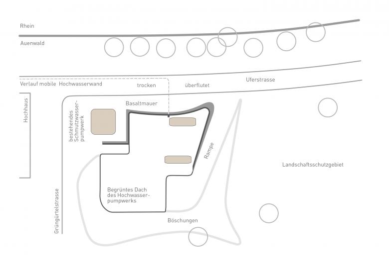 Im Rahmen der Hochwasserschutzmaßnahmen für Köln wurde am Rheinufer südlich von Rodenkirchen ein neues Pumpwerk als technisches Bauwerk errichtet. Aufgabenstellung des Wettbewerbs war die gestalterische Einbindung des größtenteils unterirdischen Bauwerks an dieser sensiblen Schnittstelle zwischen