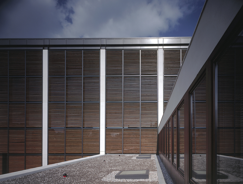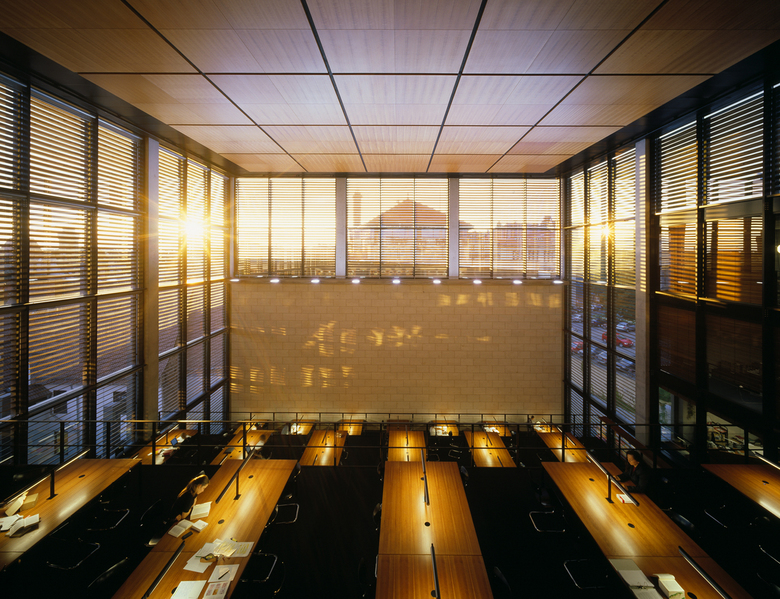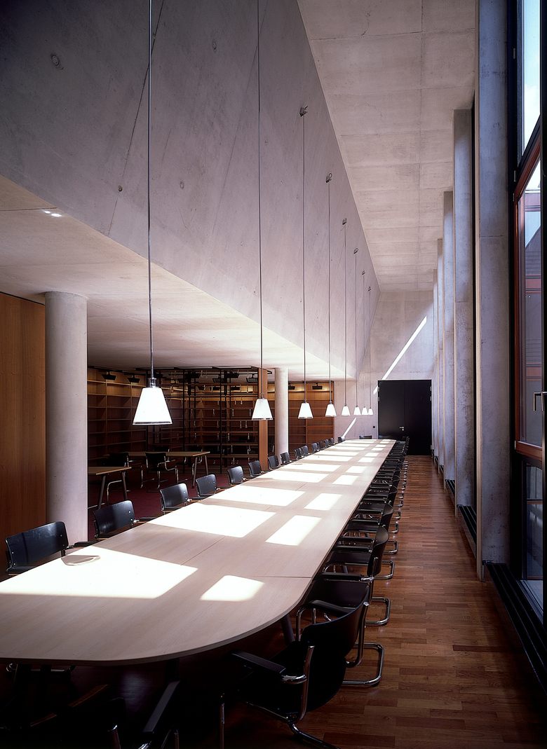 Die Ausformulierung der Terrassen innerhalb des Bibliothekskubus differenziert nach Westen das Volumen der Fakultätsräume zur mittelalterlichen Stadtstruktur, wodurch ein maßstäblicher Übergang geschaffen wird.