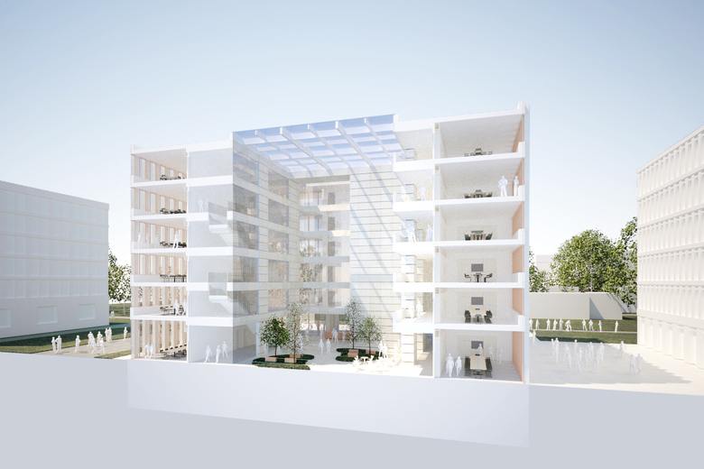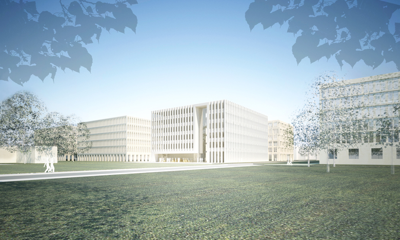 Die Entwurfsverfasser beantworten die Entwurfsaufgabe mit einem eleganten, unprätentiösen Kubus, der einerseits sein wesentlichen auf einen Raumtypus zugeschnittenes Nutzungsprofil und die flexible Aufteilung nach außen zeigt und sich andererseits in Richtung Westen zum Campus hin mit einer Geste öffnet, die Fern- und Nahwirkung in einem Fensterelement gestalterisch zusammenfasst.