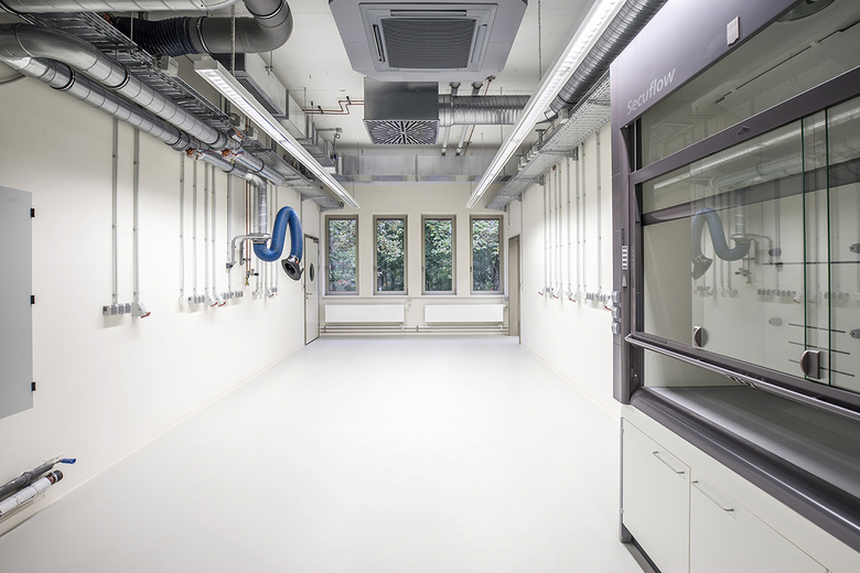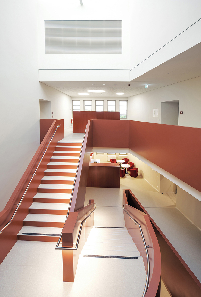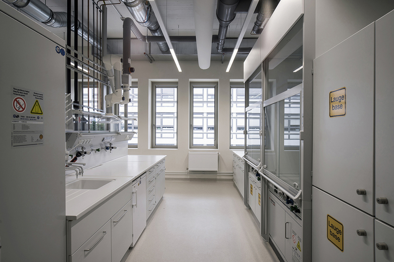 Der Entwurf schließt mit dem 2-geschossigen Sockel den Raum hinter dem Hörsaalgebäude ohne die Durchwegung in das Engler-Bunte-Gebiet zu verhindern. Die städtebaulich höchst differenzierte Struktur, die vom Hörsaal vorgegeben wird, findet mit der Lösung eine selbstverständliche Antwort. Über dem Sockel stehen die beiden Institute als gläserne Körper, die scheinbar schwebend ihre Autonomie und Zusammengehörigkeit zum Thema machen. Die Eingangssituationen sind klar ablesbar. Im Inneren wird Wert auf eine klare sinnfällige Organisation der Grundrisse gelegt. Büros und Labore befinden sich auf dem gleichen Niveau. Dies verspricht eine effiziente Nutzbarkeit des Gebäudes. In jedem Geschoss befinden sich gut belichtete Kommunikationszonen, die diese Bezeichnung auch verdienen.
