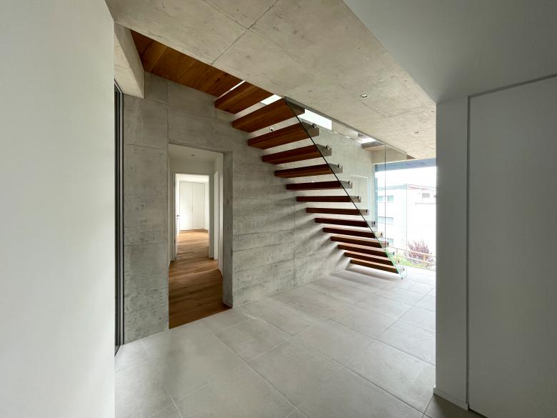 Abschliessbare Zimmer und Nasszellen werden so gestapelt, dass ein vertikaler Bewegungsraum mit wechselseitig angeordneten Köpern mit auskragenden Treppen entsteht. Die vertikale Erschliessung wird zum Ort, wo man die spezielle Lage des Hauses erlebt. Man bewegt sich immer entweder gegen den Hang oder mit Blick auf den See. Der «Kluftraum» geht nahtlos in die Wohnräume über. Durch diesen erlebnisreiche Raumfluss entsteht Grosszügigkeit.