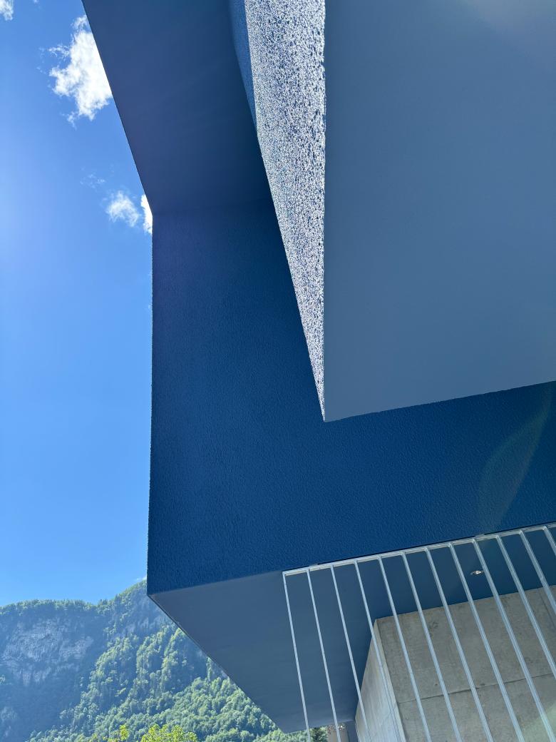 Das Farb- und Materialkonzept entwickelt sich aus dem Raumkonzept: Die wechselseitig angeordneten Körper, aus welchen die Treppen auskragen, werden in Sichtbeton belassen. Treppen und Podeste aus sägerohem Holz kragen in den «Kluftraum» oder spannen sich wie Brücken zwischen die Zimmerblöcke und verdeutlichen die Struktur des Hauses.