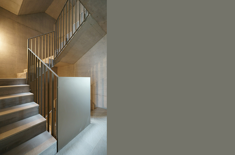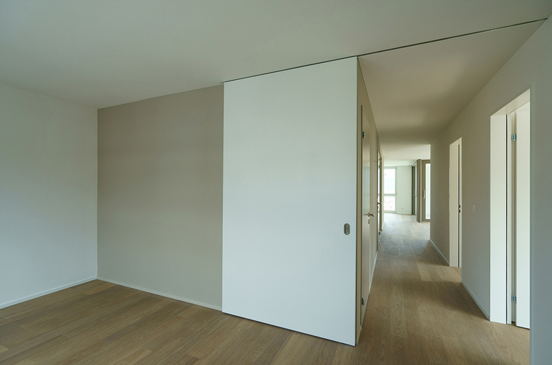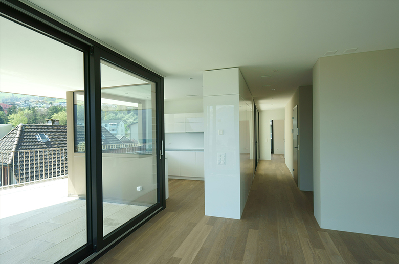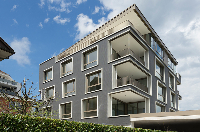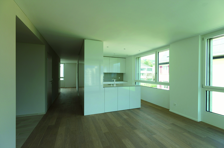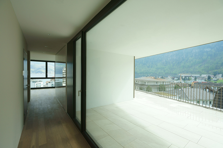 Ein zentral gelegenes, über ein Oberlicht belichtetes Treppenhaus erschliesst in den Regelgeschossen jeweils zwei Wohnungen. Die Grundrisse sind entsprechend der Struktur des Hauses zentrifugal organisiert. Das gegenüber dem Hauptkörper verdrehte Attikageschoss gibt diesem Thema eine zusätzliche Dynamik. Um den Treppenhauskern befindet sich eine Nasszellenschicht. Zwischen der Nasszellenschicht und den peripher angeordneten Zimmern und Loggien erstreckt sich ein fliesender Raum mit interessanten Durchblicken, was den Wohnungen eine Grosszügigkeit verleiht. Sämtliche Geschosswohnungen weisen eine grosse Loggia mit Blick auf den Vierwaldstättersee auf.