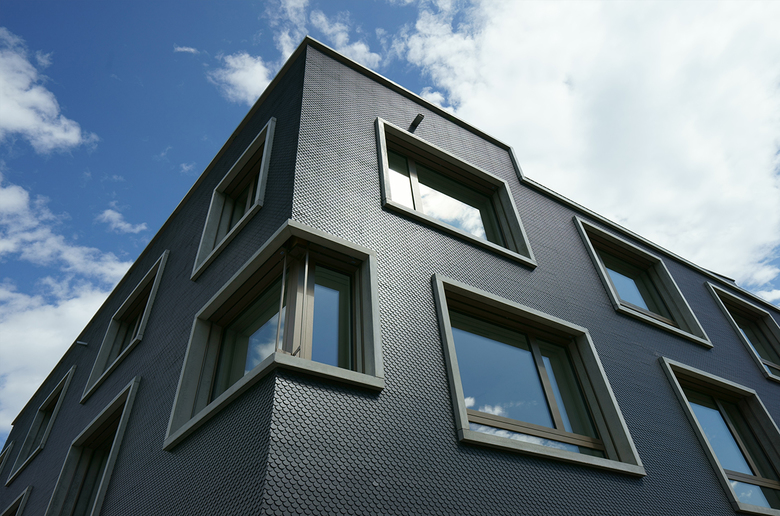 Die Fassadengestaltung schafft einen fliessenden Übergang von der grosszügig geöffneten, auf den See orientierten Ostfassade, zu der eher geschlossenen strassenseitigen Westfassade, indem die Fenster auf den dazwischen liegenden Nord- und Südfassaden von Osten nach Westen hin kleiner werden. Die Abtreppung folgt dem Gefälle des Hanges. Betrachtet man das Gebäude von unten her, wird die Perspektive durch die abgetreppte Fensteranordnung übersteigert und umgekehrt, von der Strasse her betrachtet, gebrochen. Diese optischen Besonderheiten geben der Fassade eine leichte Bewegtheit und damit Lebendigkeit. Die Fassade wird mit regionaltypischen Schindeln verkleidet.