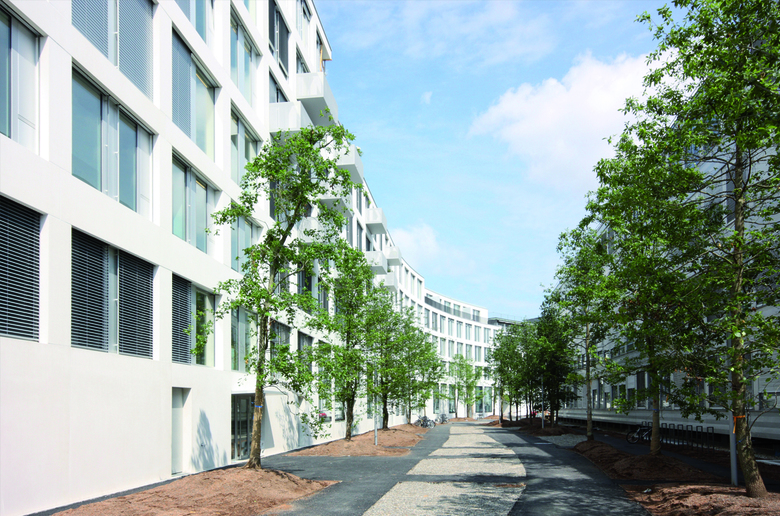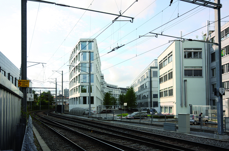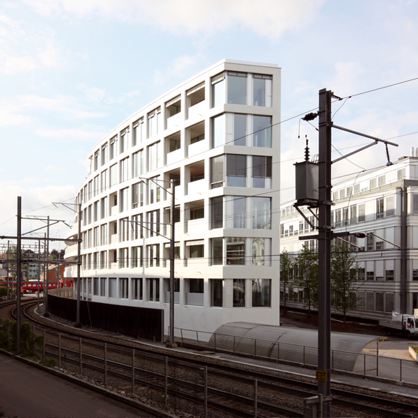 Edendrei bildet städtebaulich die Verlängerung des gebogenen Gebäudes Staffelstrasse 8–12 und generiert so einen klaren, selbstverständlichen Abschluss gegen die Sihltalbahn. Ein strenges Grundraster analog der umliegenden Gewerbebauten prägt den Baukörper.