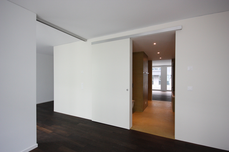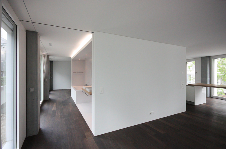 Es wurden verschiedene Innenausbaukonzepte entwickelt, die je nach Bauherrenentscheid in die geschaffene Struktur eingesetzt werden können: für die Büronutzung ein Dienstleistungs-/Büromodul, für den Wohnungsbau ein Standardwohn- und alternativ dazu ein Loftmodul. Beide Wohnmodule spielen mit der zweiseitigen Ausrichtung der Wohnung, jedoch mit verschiedenen räumlichen Aussagen: während mit dem Loftkern und dem Umfliessen eines zentralen Körpers ein gängiges Raummodell umgesetzt wird, spielt der Standardkern mit einem trennenden Element als Verbindung der beiden Wohnungsseiten.