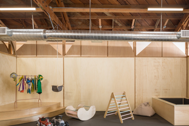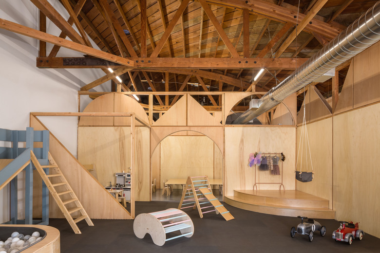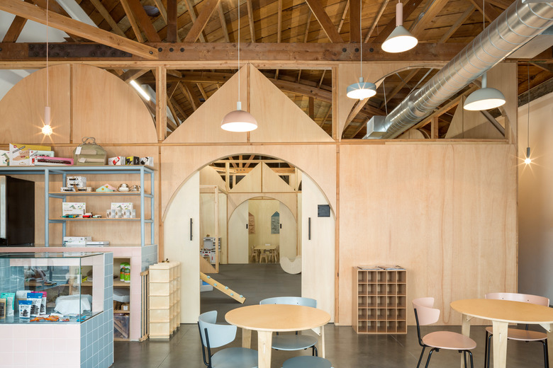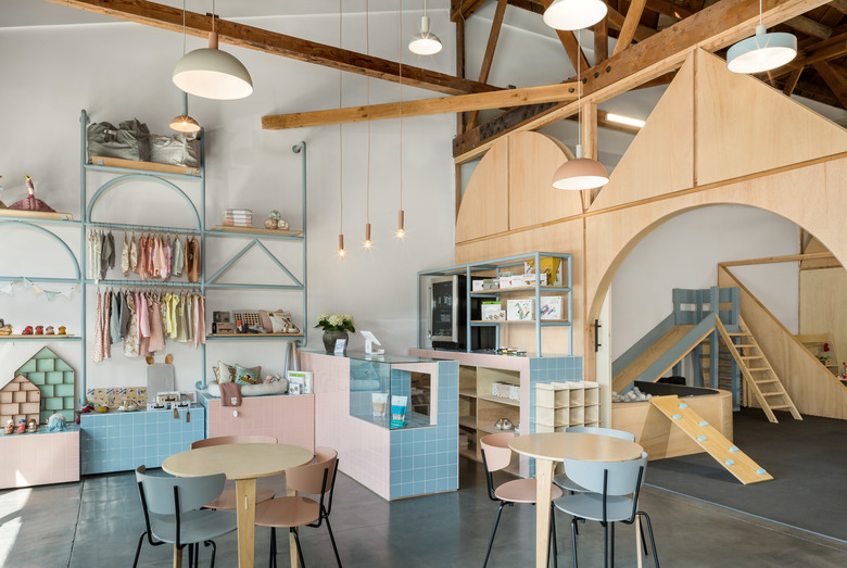 La primera un área de bienvenida, compuesta por cafetería y tienda, la segunda y central, el parque infantil, corazón del proyecto y la tercera y última, más resguardada, un área de trabajo o co-working.
