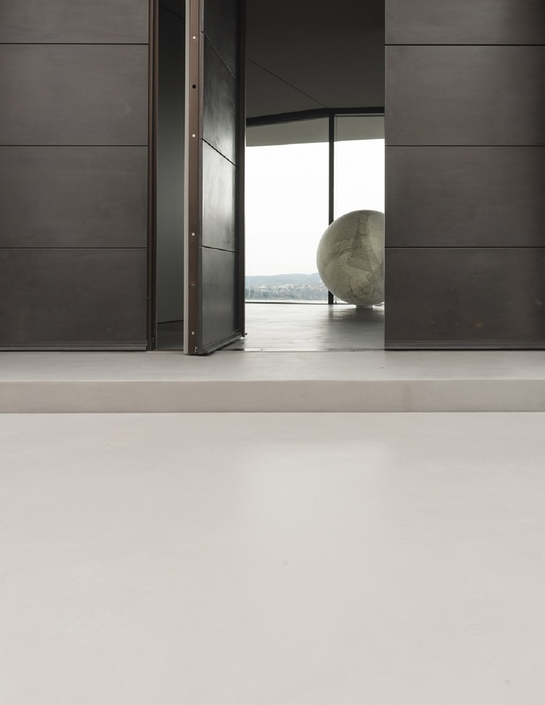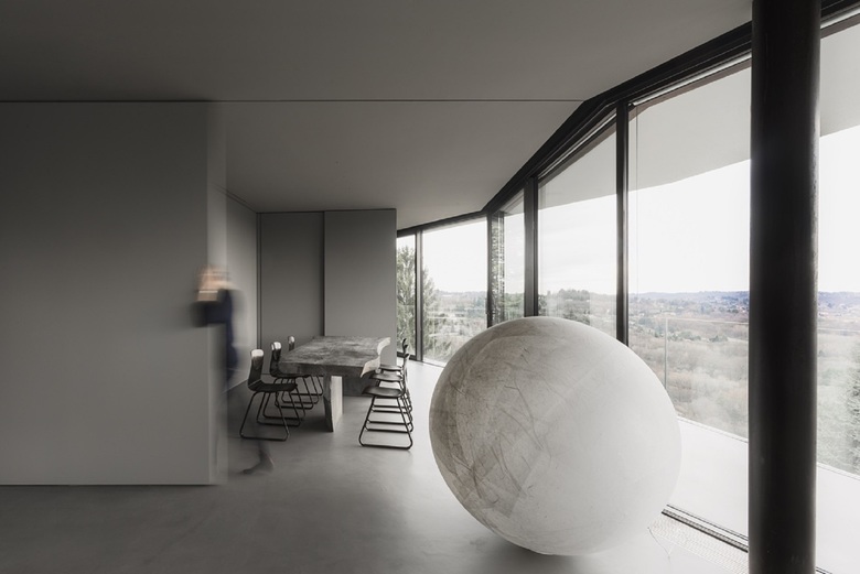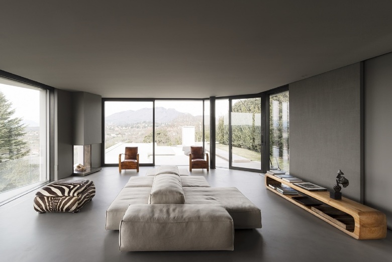 All'esterno in prossimità delle vetrate del soggiorno l'acqua della piscina riflette la variabilità del cielo. All'interno a breve distanza il fuoco di un braciere appoggiato a terra scalda e tiene compagnia nelle fredde giornate invernali.