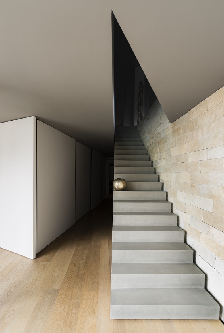 Il livello inferiore presenta uno sviluppo longitudinale e ipogeo, inserendosi nel pendio come un terrazzamento naturale in pietra. Qui trovano spazio le camere, lo studio e la zona palestra.