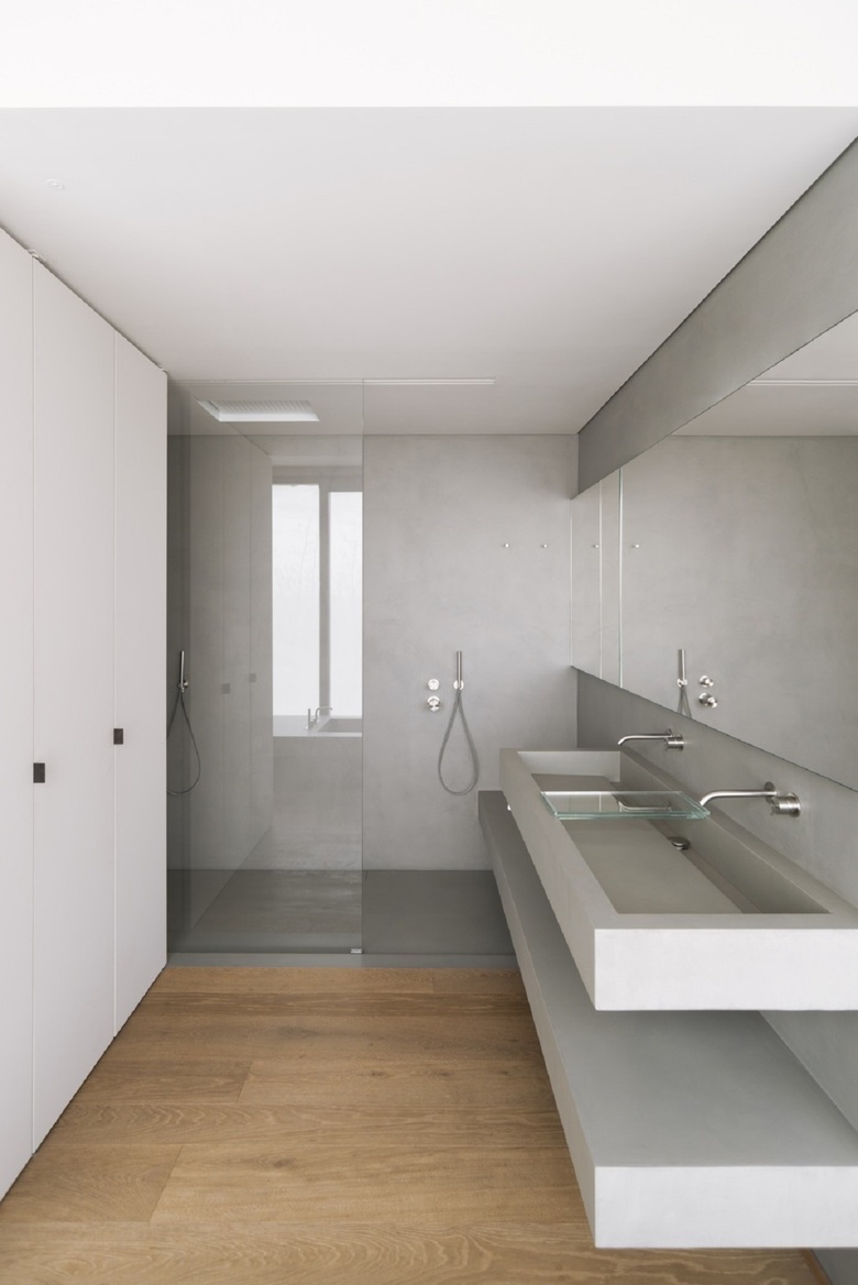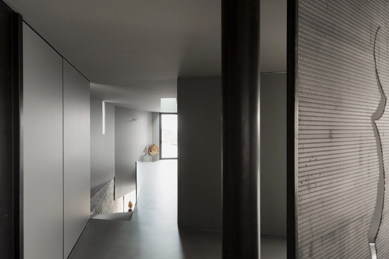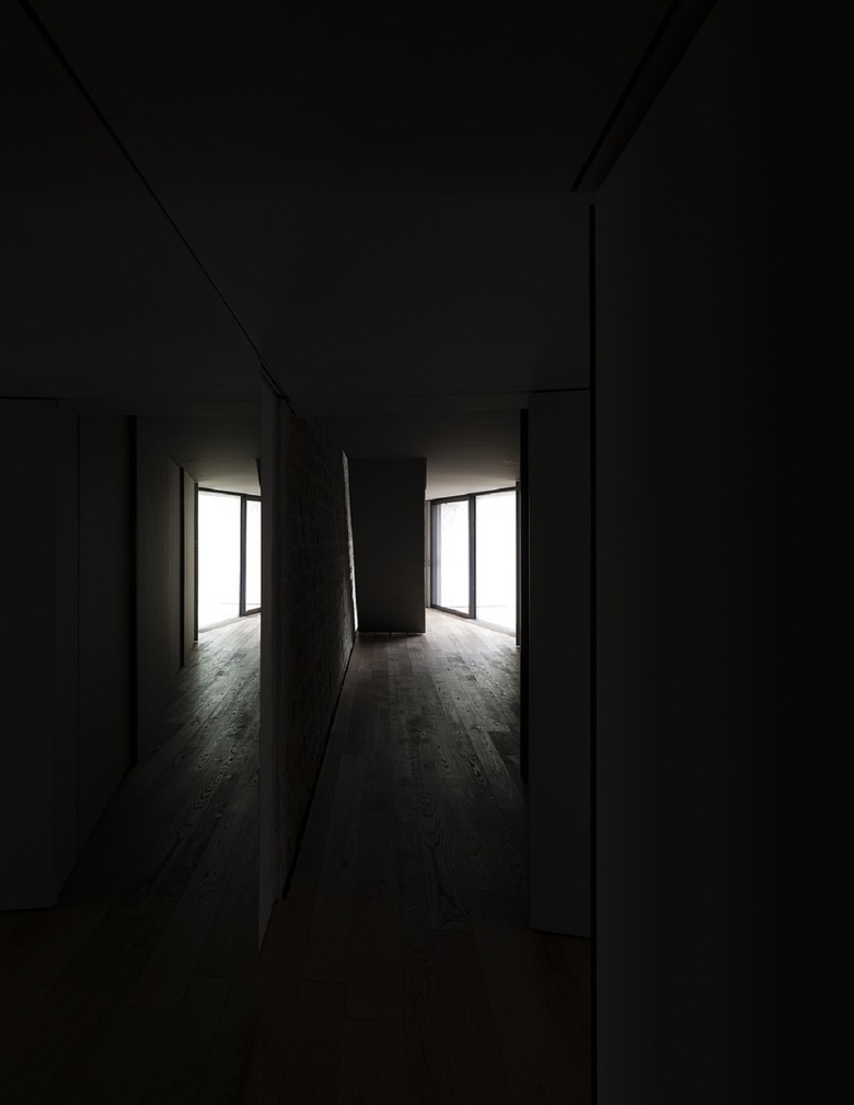 Un ulteriore piano di controllo del progetto è stata l'attenzione posta alla dinamica delle linee naturali di luce e ombra che si disegnano per terra nelle diverse ore del giorno. Il pavimento di cemento del livello superiore enfatizza e pone in risalto il contrasto tra chiaro e scuro, i confini qui al pomeriggio appaiono netti e precisi. Il legno del piano inferiore al contrario assorbe e attenua le differenze, i toni sono più sfumati, l'atmosfera più riposante.