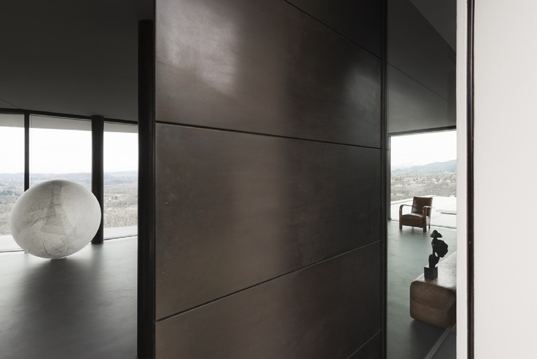 Da una parte ci sono grandi superfici vetrate che come un diaframma segmentato aprono la casa al paesaggio, dall'altra quinte di legno e nuclei funzionali interni ci portano dentro all'organismo, tracciando percorsi fluidi e continui che si affiancano alle vetrate per poi rientrare nella penombra degli spazi più interni.
