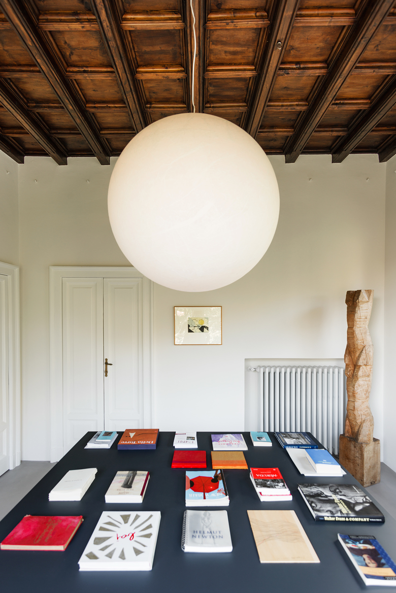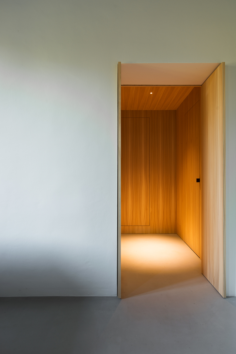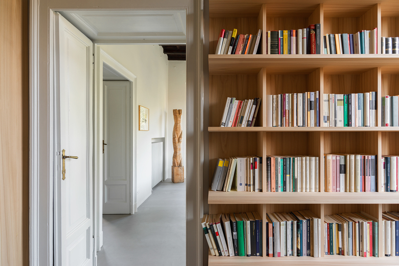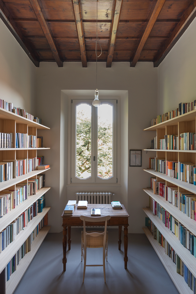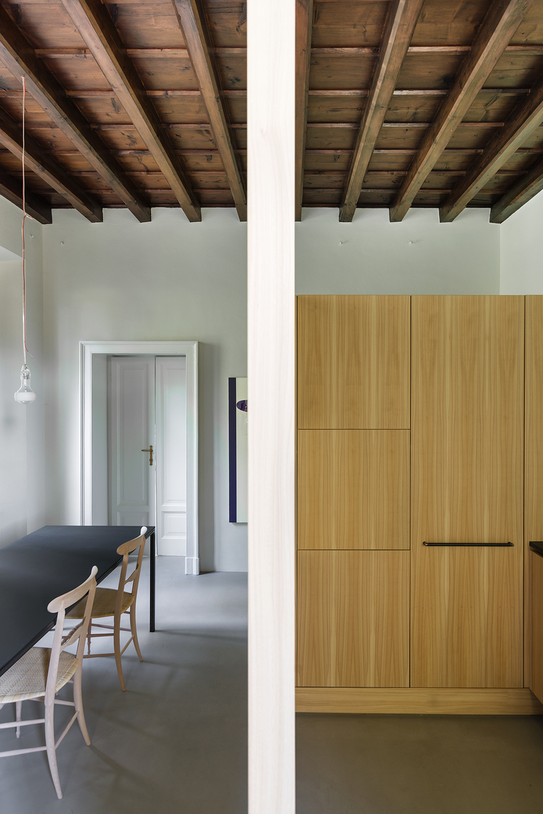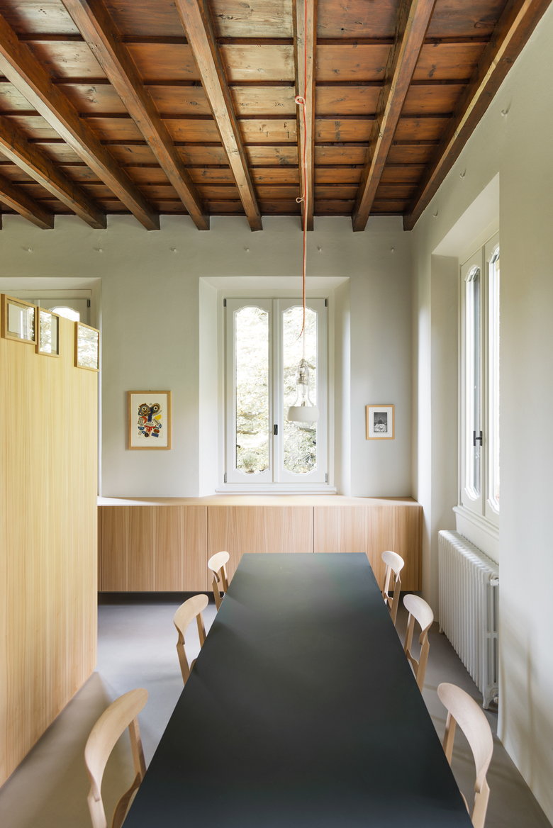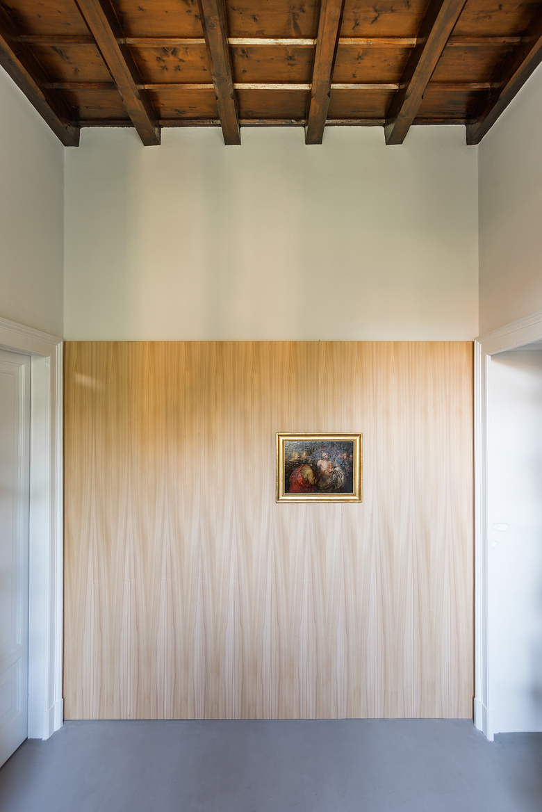 La morbida venatura verticale del legno di olmo ci accoglie all'ingresso. La ritroviamo poi nella biblioteca e nella cucina. Una materia bellissima e preziosa per il suo colore, per il suo disegno e per la sua età e di cui il cemento esalta la naturalezza.