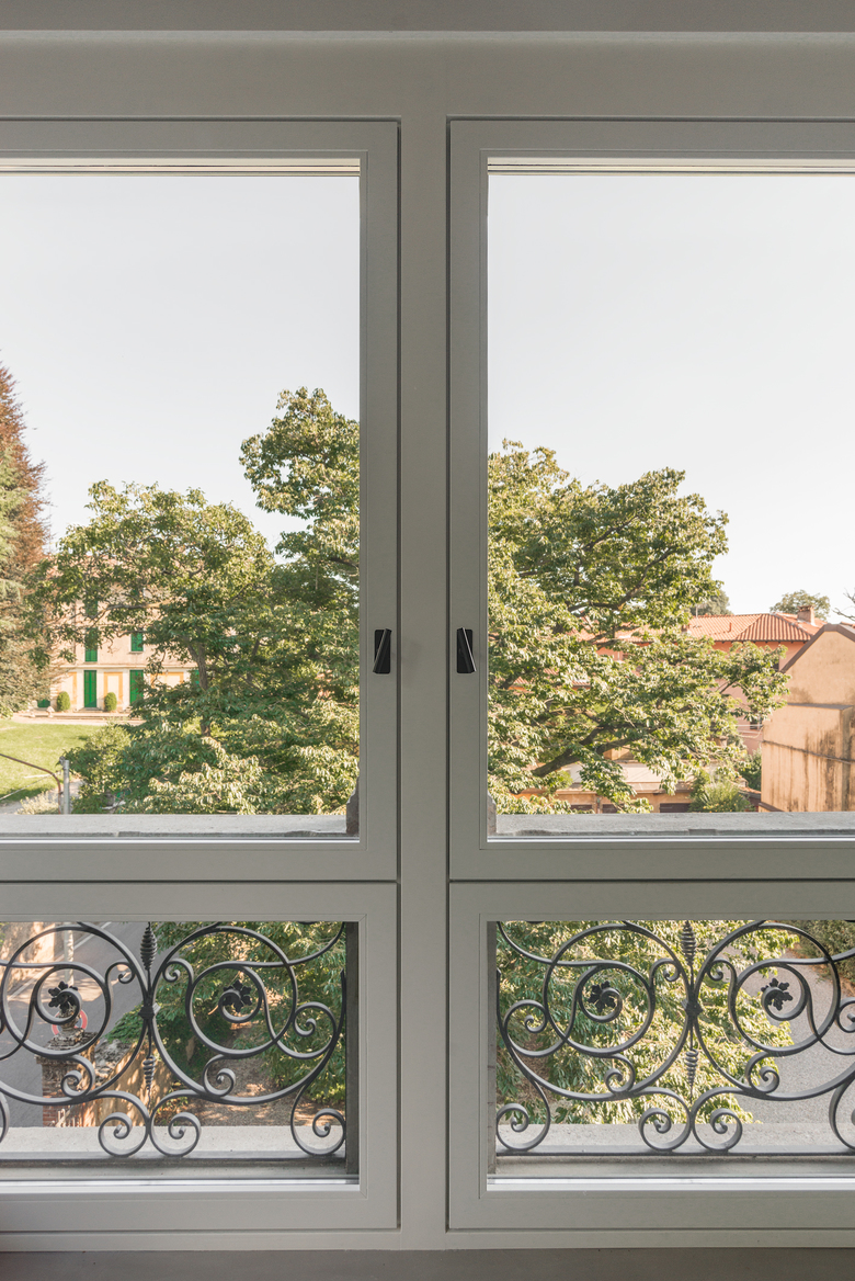 Le finestre, ampie e tutte uguali tra loro, ad eccezione della veranda, si distribuiscono con ordine su tre lati della casa.