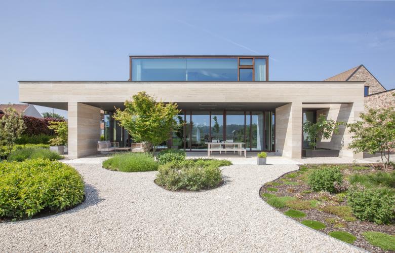De natuursteen geeft ook het terras vorm. De hoeken zijn daarbij niet afgesneden, wat de openheid naar het landschap versterkt. Het terras definieert het grondplan van de nieuwbouw ook in de buitenomgeving. De bureauruimte krijgt een eigen gekadreerd terras waarvan het dak deels is geperforeerd. Het terras krijgt zo twee volledig verschillende belevingen.