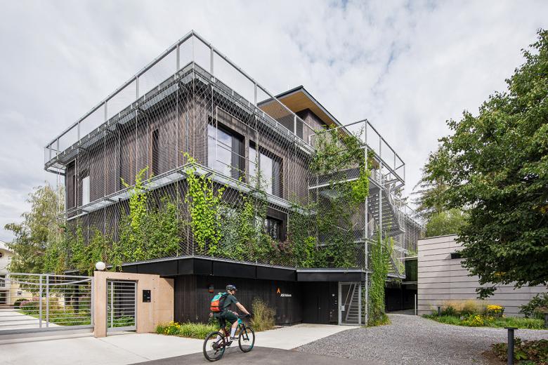 Surrounded by a lush exterior, the four-story timber structure combines timber frame construction with solid wooden elements to optimize material use and allow for the greatest amount of open floor plans. In addition to the open office concept and sustainable construction methods, the building features an optimized and sustainable energy concept, based on a combination of high-tech and low-tech solutions.