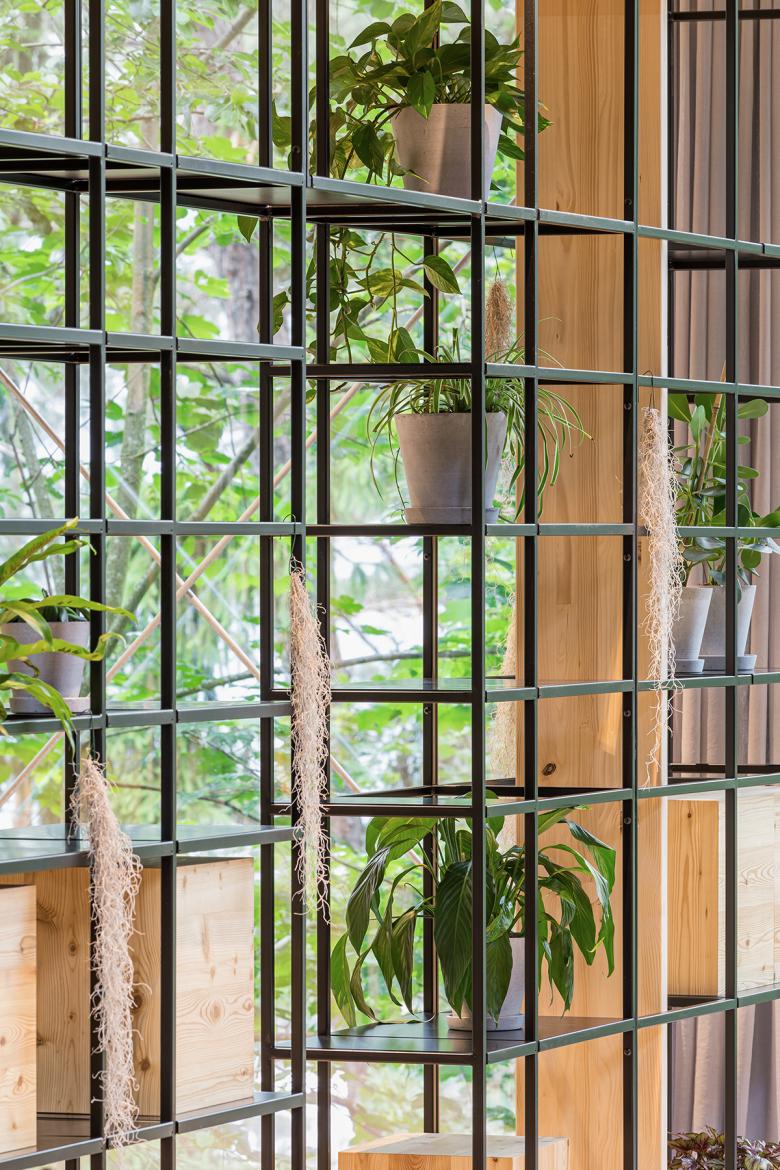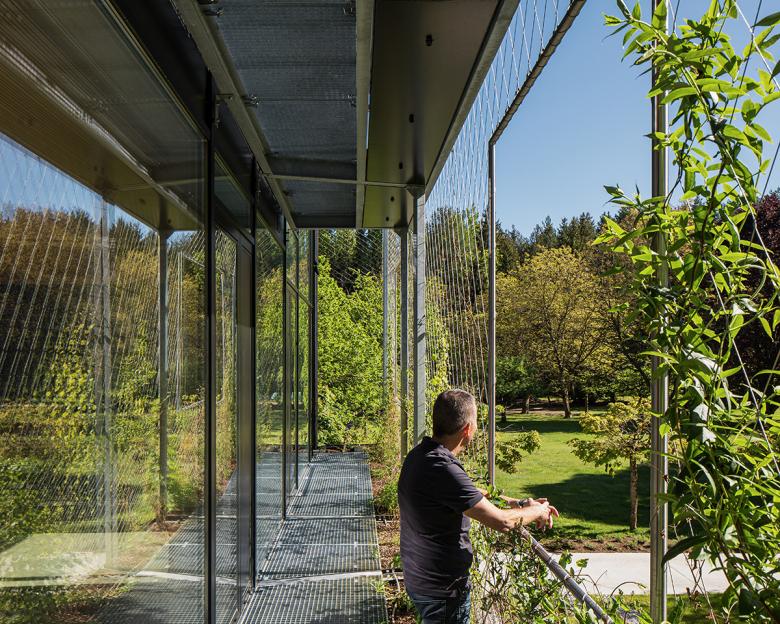 A “green curtain” of climbing plants growing on a suspended metal frame covers the blackened wooden façade, ensuring the building blends harmoniously into its verdant forest surroundings. Composed of 17 different warm weather and evergreen species growing in big planters, this green curtain also serves as a glare shield and for shading the generous glass surfaces. On the western side, the employees can use this metal frame as balcony. The 118 climbing plants change the appearance of the façade throughout the year and thus also adapt to seasonal thermal insulation needs. The microclimate created by this green buffer zone reduces the energy required for cooling the building.
