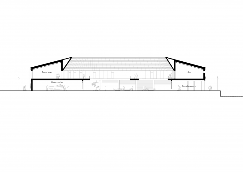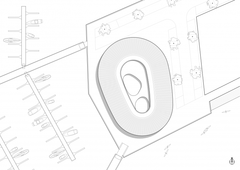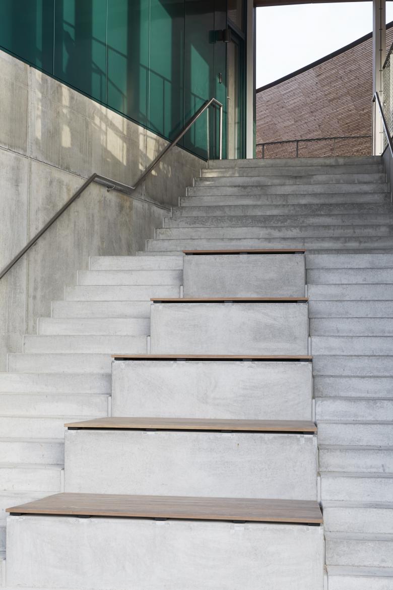 One such area, and the heart of the project, is a lifted, publicly accessible terrace, gathering all the different activities of the building. Connected to the first floor, the terrace is accessible from the two main stairs, creating an amphitheater. Along these two ​ amphi stairs, visitors can enjoy the view and the maritime activities on smaller wind-protected terraces on the first floot.