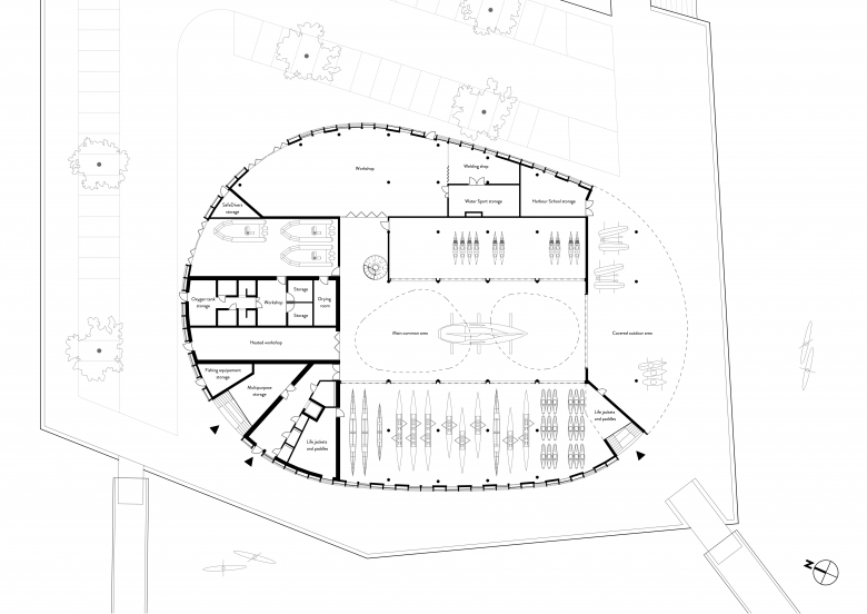The upper level of the building houses various clubs, including clubs for rowing, kayaking, sailing, diving and triathlon, as well as common areas, an educational center and training facilities. On the lower level, directly connected to the sea by a bridge, one can find the boat storage and workshop space. Large windows throughout the building’s façade give plenty of daylight and visibility inwards, while also connecting the center to its surroundings. At night, a warm glow shines through the windows, lighting the center up like a lantern.