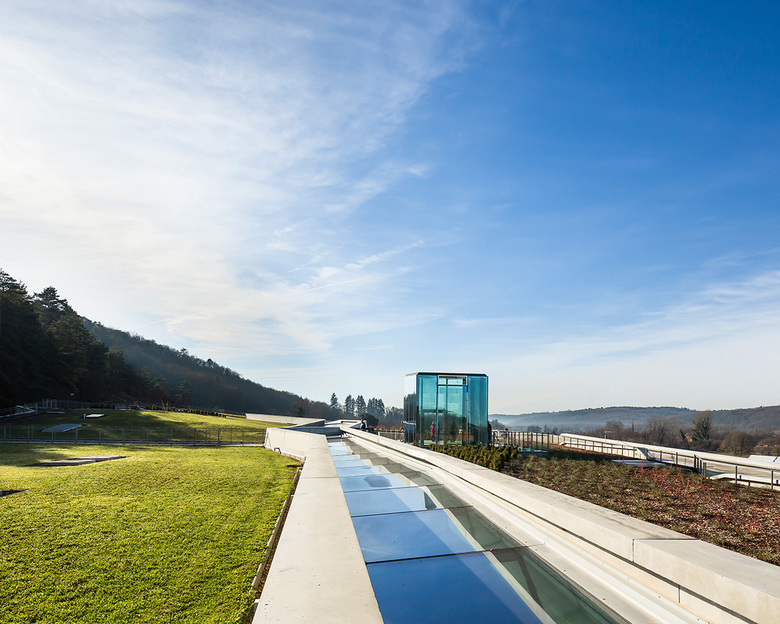 The visitor experience is carefully sequenced. Beginning in the lobby, visitors ascend by a lift to the belvedere out on the roof, where they can enjoy a magnificent panoramic view of Montignac and the Vézère Valley. They then descend a gentle slope towards the cave facsimile, which follows the incline of the roof towards the edge of the forest until reaching the entrance to the replica. The winding path through the landscape and gradual descent back down to grade facilitates a mental transition through time and space, creating an experience similar to that of the cave’s first discoverers in 1940.