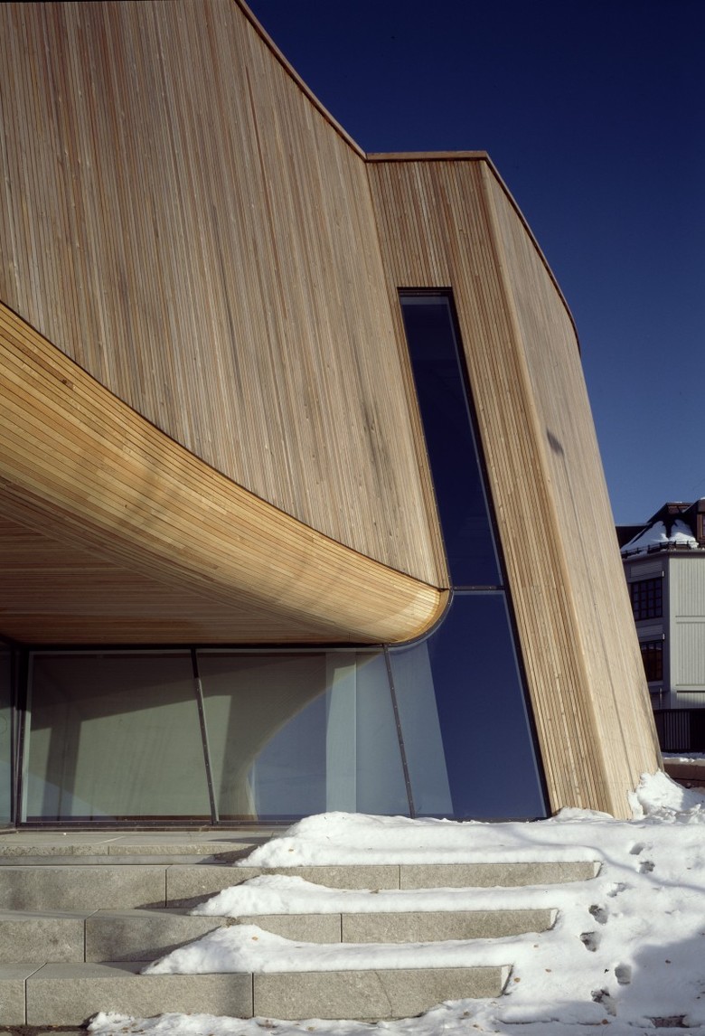 The building then relates itself to both characteristics visible from its location and thus becomes a versatile negotiator between immediate and distant contextual conditions. The orthogonal public entrance spaces were designed as transparent as possible, while the softly tilted and curved exhibition spaces were clad with Siberian untreated larch. Natural light is drawn in by integrated lights along the curving geometry of these walls.