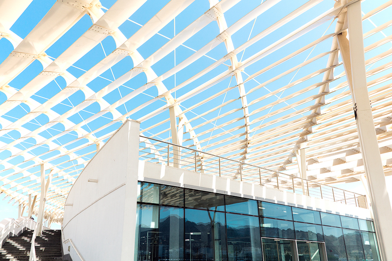 On street level, the new market enhances the public setting by forming a dynamically shaded canopy, organizing the spaces beneath it. The canopy’s form is derived from the sinuous flow of Arabic calligraphy. It follows the logic of a playful movement of light and shadow built from aluminum fins which provide shade, natural ventilation, and an ephemeral appearance. The complexity of the canopy roof contrasts the simple solidity of the concrete structure below it.
