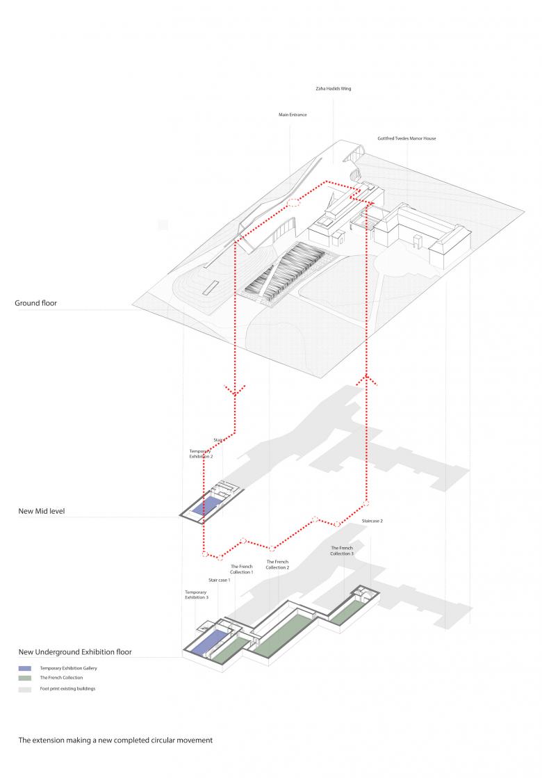 Conceptually dubbed “Himmelhaven” (“Heaven’s Garden”) the extension exterior is very much a “clin d’œil” to the impressionistic art period, characterized by its constant efforts to capture light and its changing qualities, and immortalized on canvases by world-renowned artists such as Manet, Monet, Degas, and Renoir. The structure is further characterized by a diagonal cut in the landscape that intuitively leads visitors to the main entry by Hadid’s 2005 extension. The cut forms a bridge of natural stone linking entry and garden.