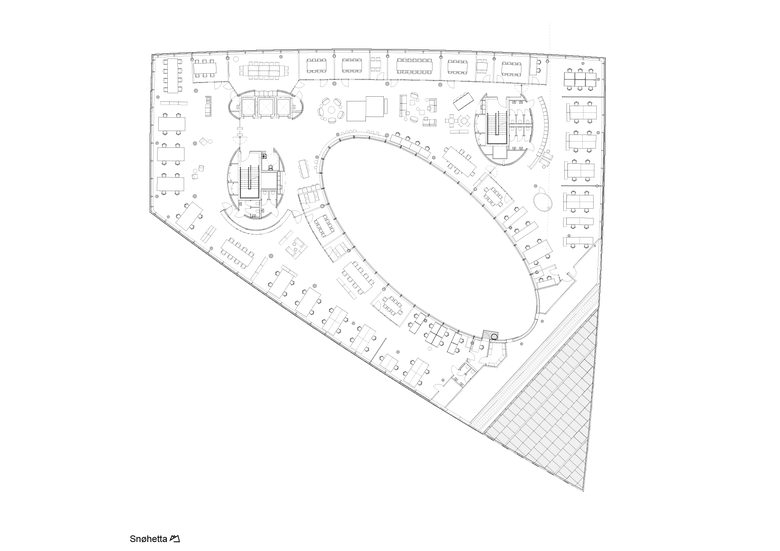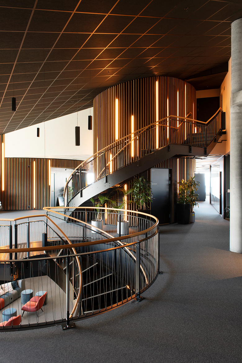 Viewed from the harbor front, the building façade’s sides cants inwards, bringing associations to how the building is bursting with energy. From the opposite approach, the sloping roof of the building reveals a cutout in the center of its plan that allows daylight to flow into the office spaces. Within this illuminated core is an atrium that functions as a public garden with horizontal glass windows on the sides, providing skylight into the below canteen. This skewed lightwell allows daylight to enter the building on every floor, and gives the people working inside a great view of the city. The atrium also limits the amount of artificial light needed inside the building. Large glass windows and pleasant open spaces flooded with daylight contribute a comfortable and inviting work environment.