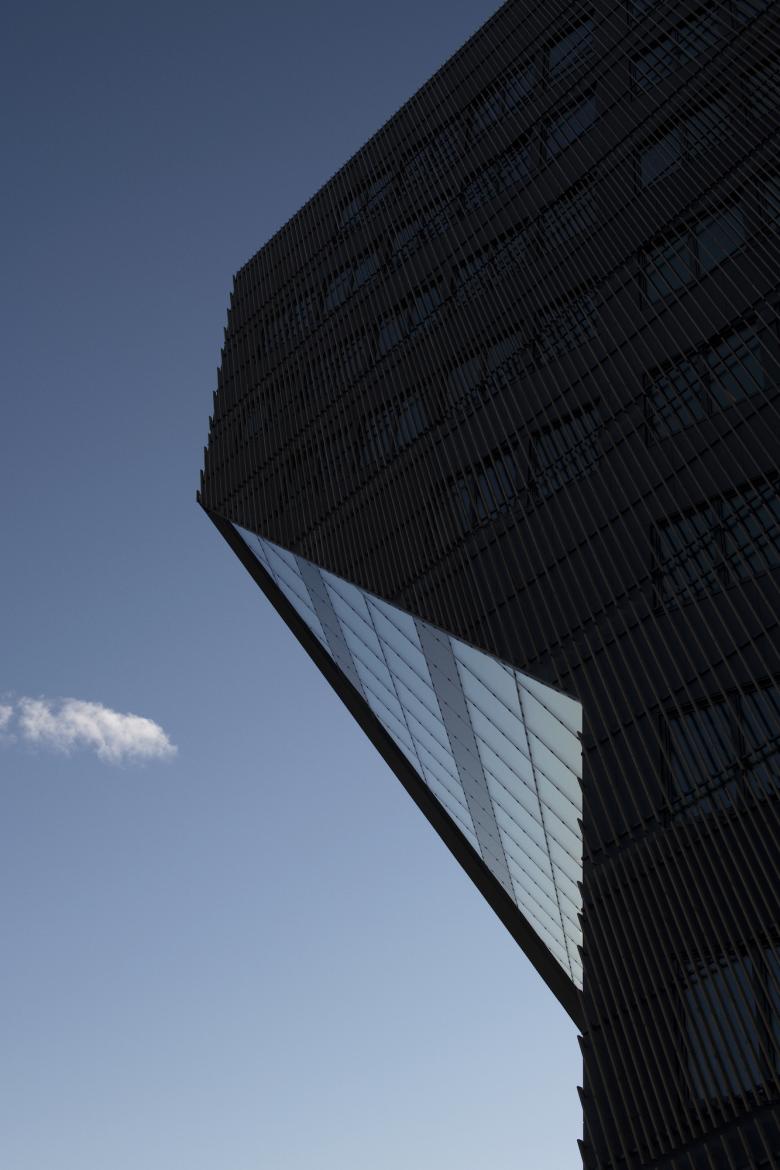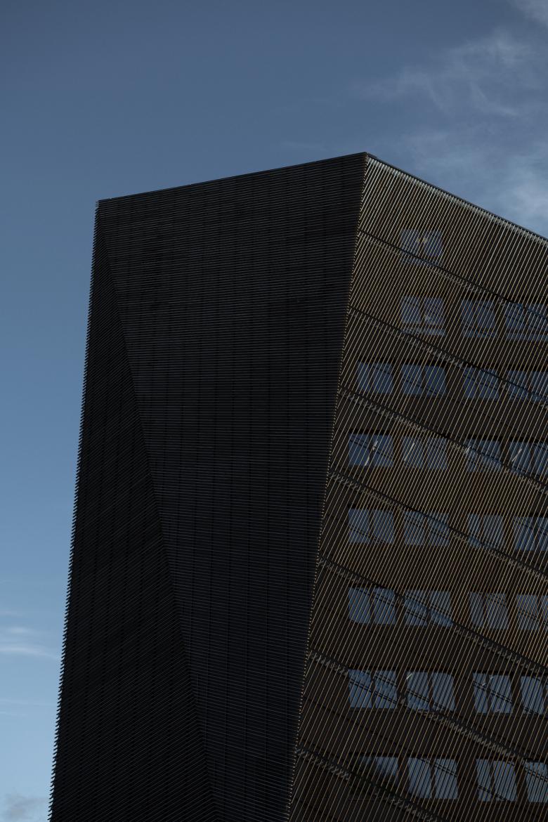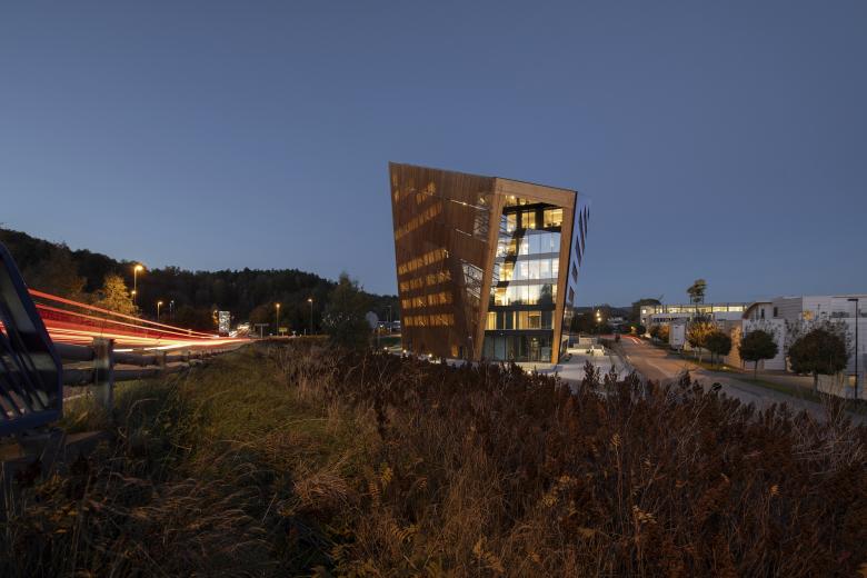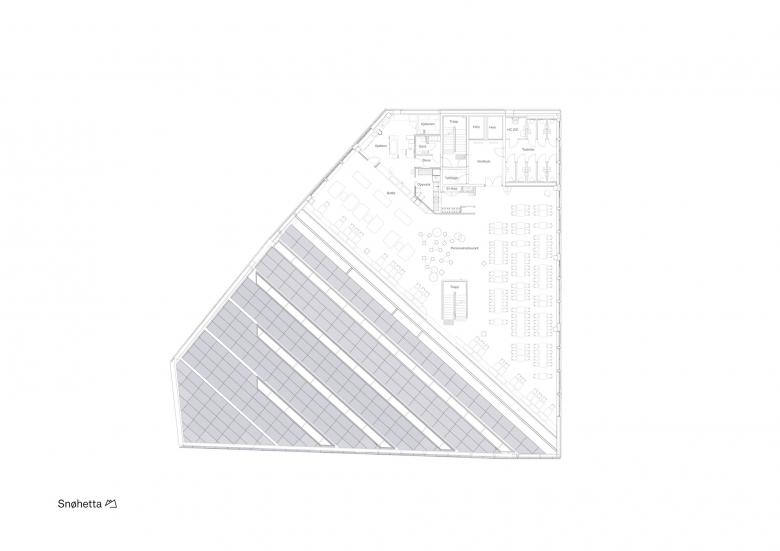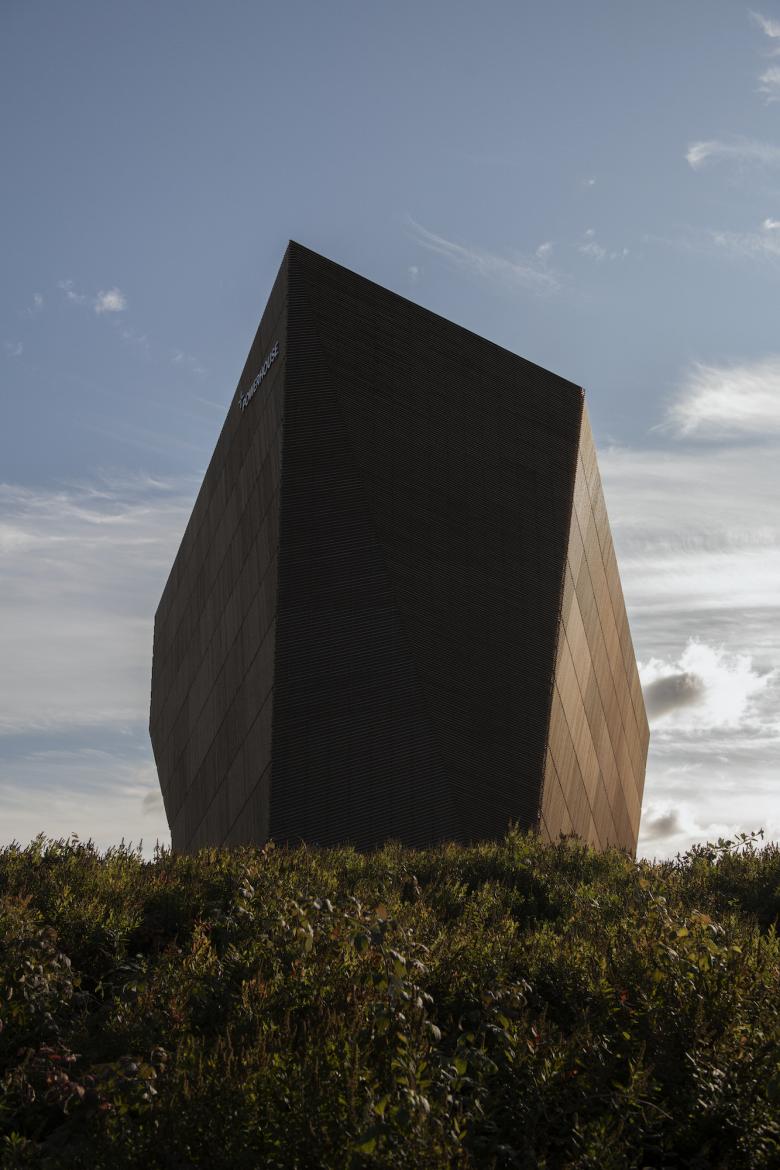 The skewed and slightly conical building features a clearly defined 45° tilting notch on the east-facing façade, giving it a clearly identifiable expression that stands out in the industrial context of the surrounding Herøya industry park. Inside, the building features a barception, office space, including two stories of co-working spaces, a shared staff restaurant, penthouse meeting spaces and a roof terrace overlooking the fjord. Two large staircases connect the building’s ground and top floors, from the reception area and all the way up to the staff restaurant and penthouse meeting rooms. A distinctive straight wooden staircase reveals itself at the ninth floor, visually tying the staff canteen and penthouse meeting room area together and leading visitors to the building’s roof terrace.